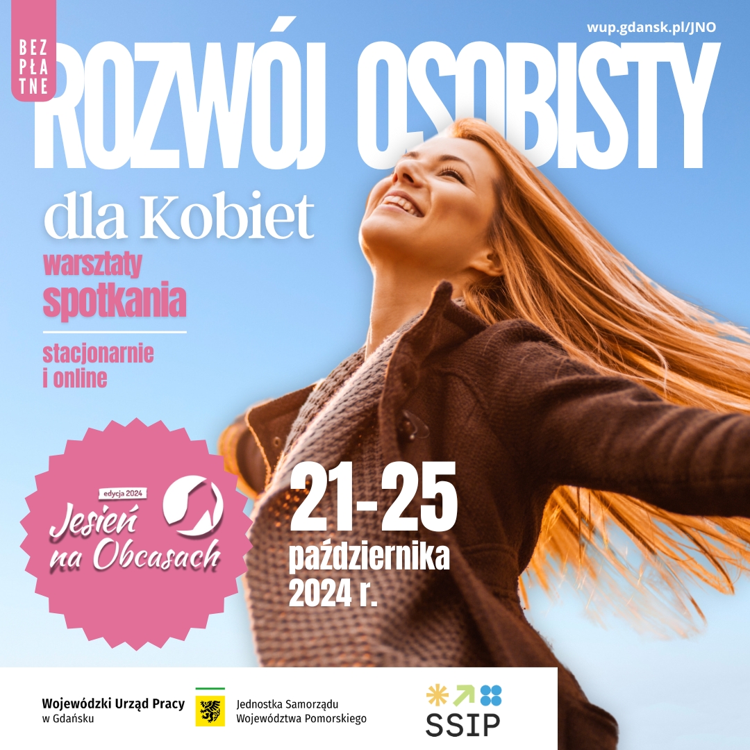 Serdecznie zapraszamy Panie do udziału w bezpłatnych webinarach z cyklu "Jesień na Obcasach", organizowanych przez Wojewódzki Urząd Pracy w Gdańsku. To kolejna odsłona popularnych warsztatów, skierowanych do kobiet, które chcą poszerzać swoją wiedzę i rozwijać umiejętności w różnych dziedzinach. Większość spotkań odbędzie się stacjonarnie w Trójmieście, Rumi i Słupsku, ale dostępne są także wydarzenia online, dzięki czemu uczestniczki z całego regionu mogą skorzystać z tej oferty.