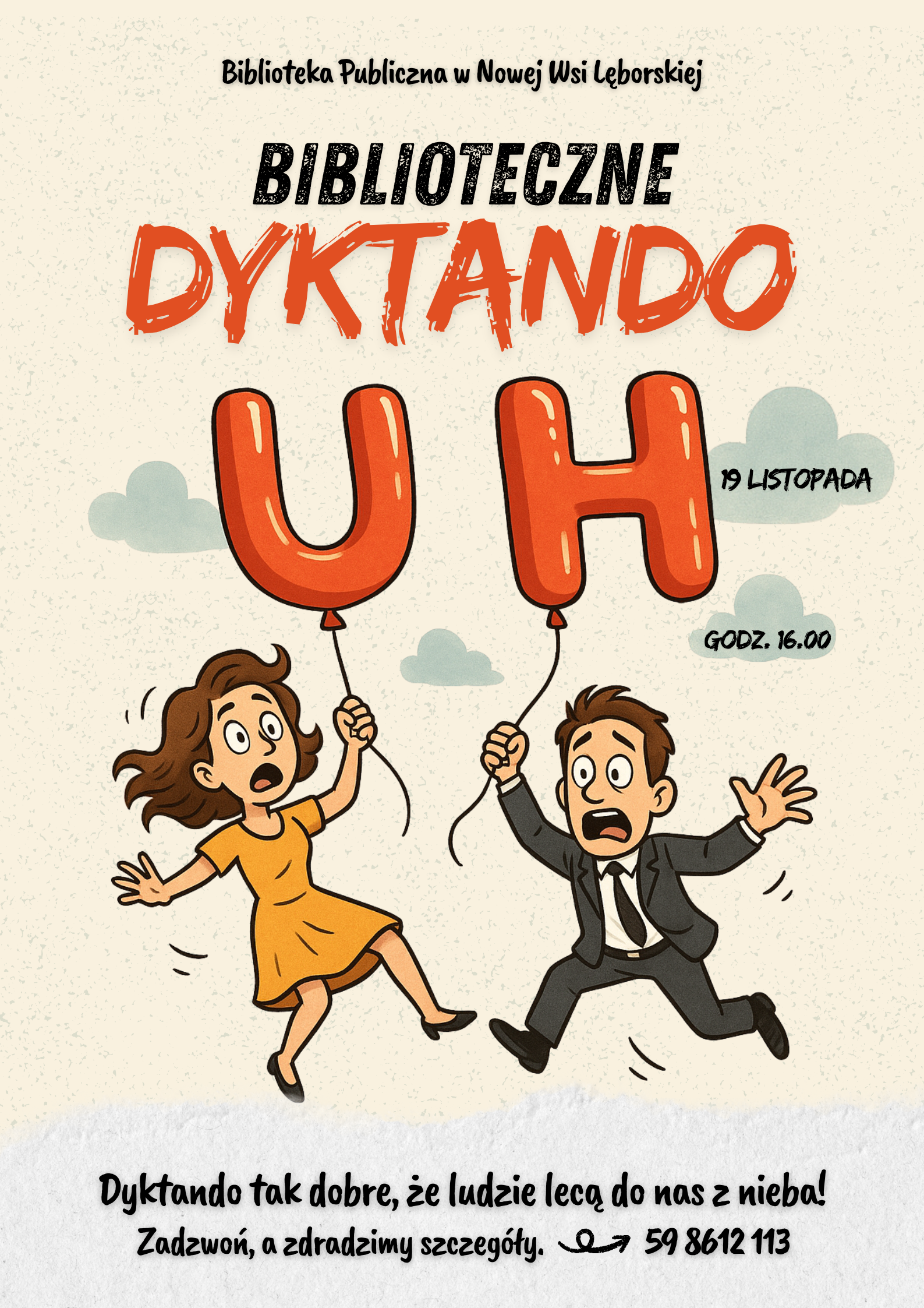 Biblioteka Publiczna w Nowej Wsi Lęborskiej zaprasza na Biblioteczne Dyktando, które odbędzie się w środę, 19 listopada o godz. 16:00 w tymczasowej siedzibie biblioteki: 84-351 Nowa Wieś Lęborska, ul. Grunwaldzka 6.