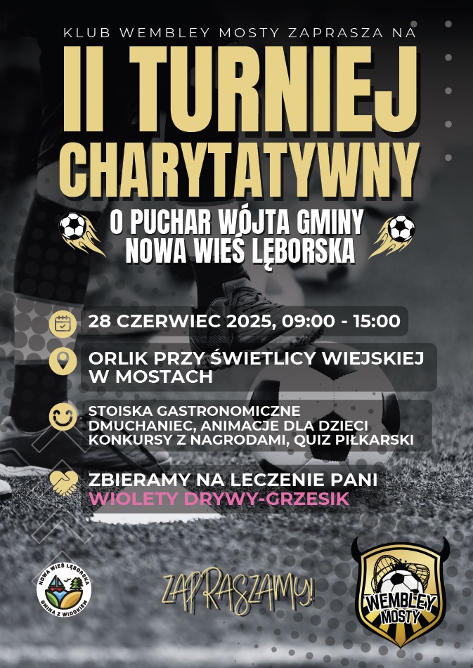 Serdecznie zapraszamy mieszkańców oraz wszystkich sympatyków sportu i działań społecznych na charytatywny turniej piłki nożnej, który odbędzie się w sobotę, 28 czerwca 2025 r. w Mostach, na boisku typu „Orlik” przy Świetlicy Wiejskiej.