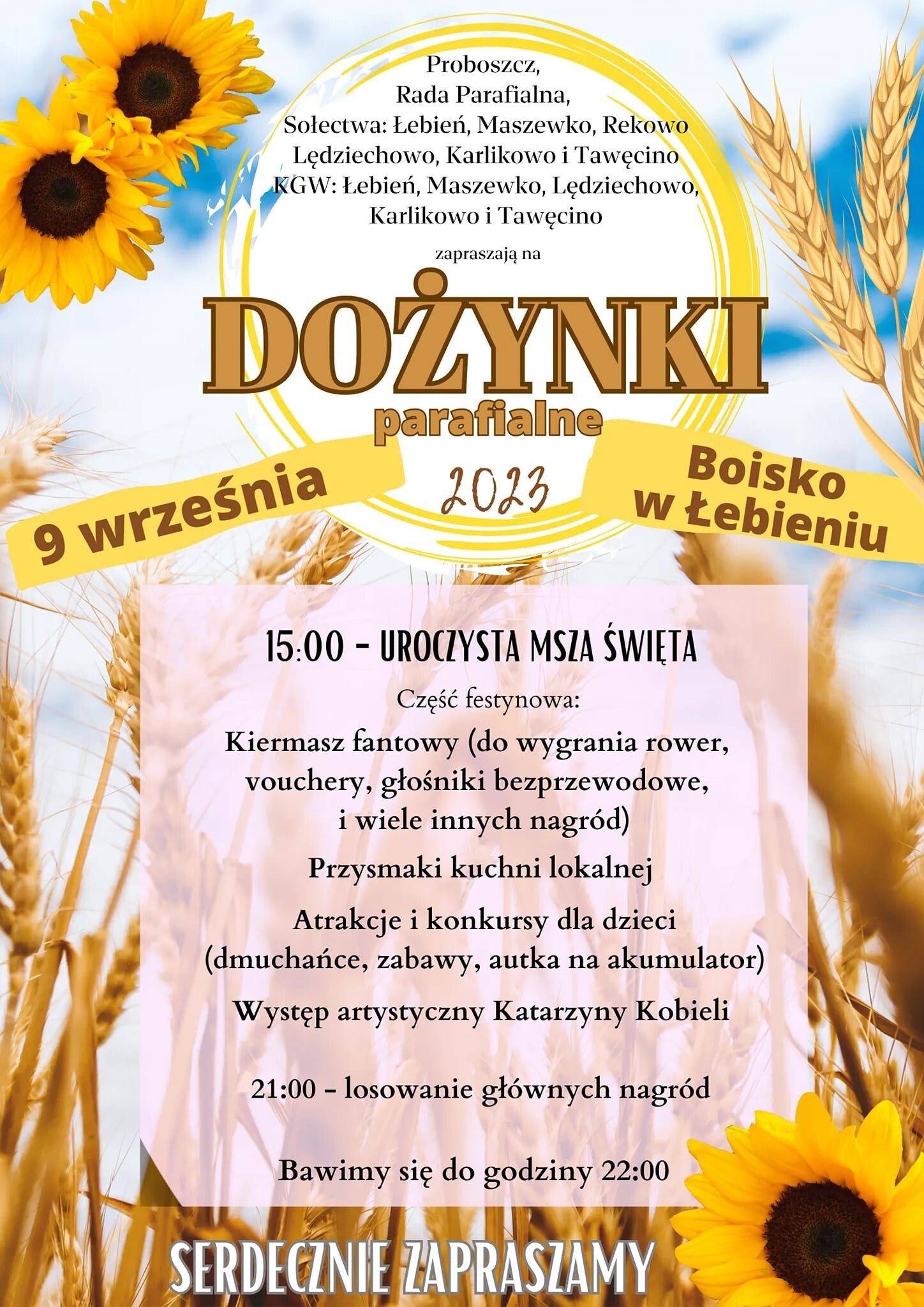 Proboszcz, Rada Parafialna, Sołectwa: Łebień, Maszewko, Rekowo, Lędziechowo, Karlikowo i Tawęcino KGW: Łebień, Maszewko, Lędziechowo, Karlikowo i Tawęcino zapraszają na DOŻYNKI PARAFIALNE w Łebieniu, 9 września, godz. 15.00, boisko w Łebieniu.
