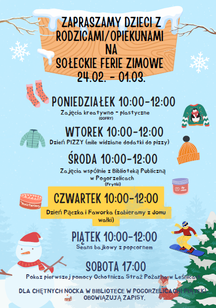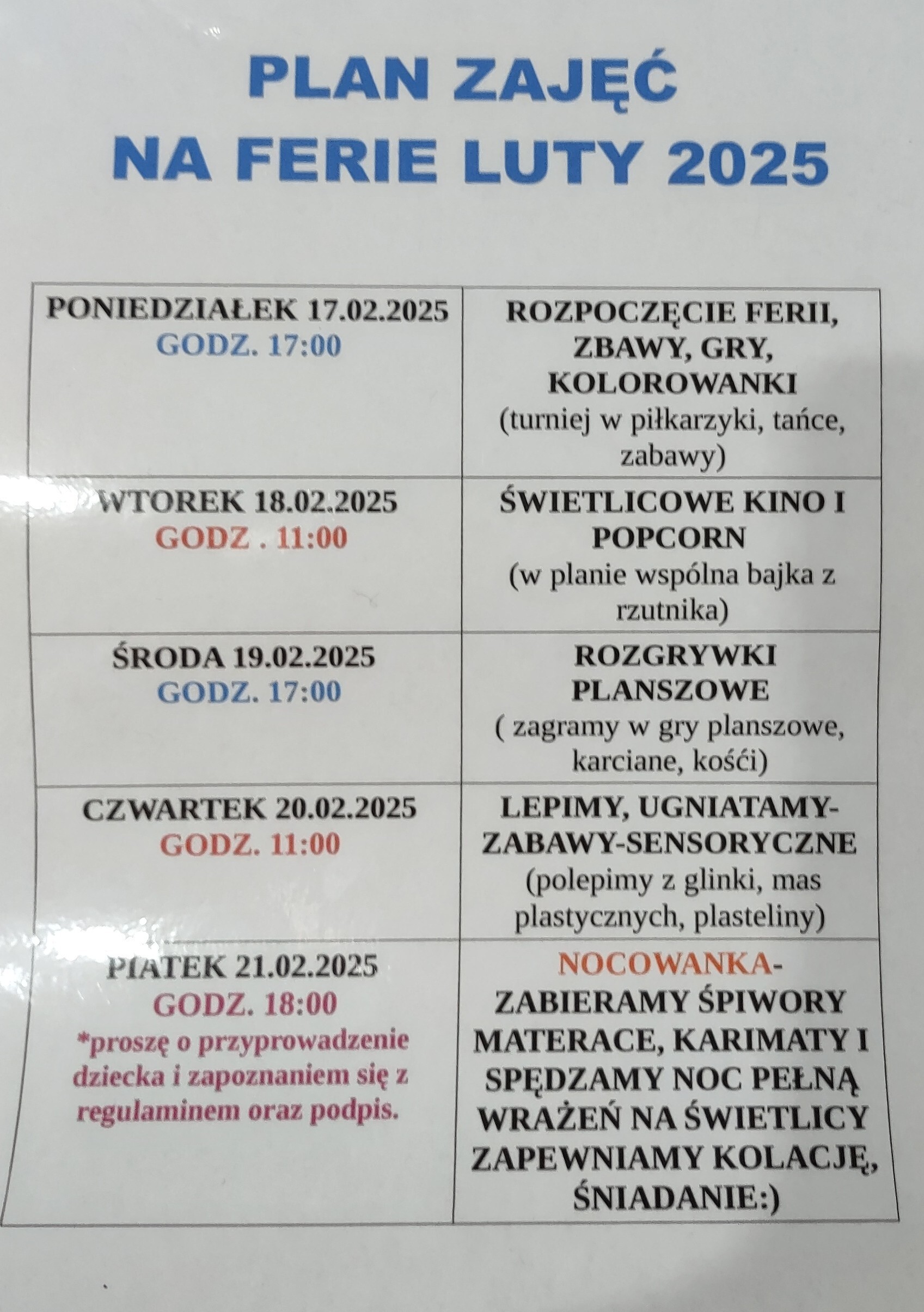 Zachęcamy do zapoznania się z harmonogramem i aktywnego uczestnictwa w wydarzeniach. Niech te ferie będą pełne uśmiechu, dobrej zabawy i niezapomnianych wspomnień!