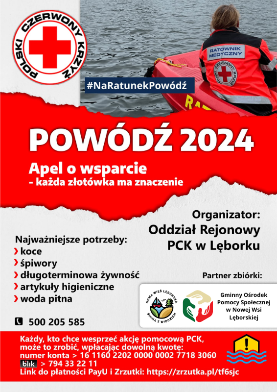 Gmina Nowa Wieś Lęborska włącza się do akcji pomocy powodzianom organizowanej przez Polski Czerwony Krzyż (PCK). Wspieramy sprawdzoną i doskonale skoordynowaną zbiórkę prowadzoną przez PCK – organizację, której można w pełni zaufać w takich sytuacjach kryzysowych.