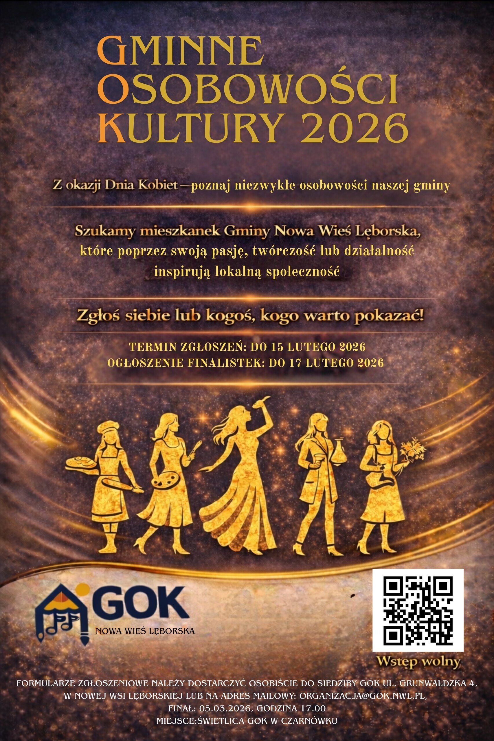 Gminny Ośrodek Kultury w Nowej Wsi Lęborskiej realizuje projekt „Gminne Osobowości Kultury 2026”, organizowany z okazji Dnia Kobiet. Celem inicjatywy jest prezentacja mieszkanek Gminy Nowa Wieś Lęborska, które poprzez swoje pasje, twórczość, działalność społeczną lub codzienną postawę inspirują lokalną społeczność.