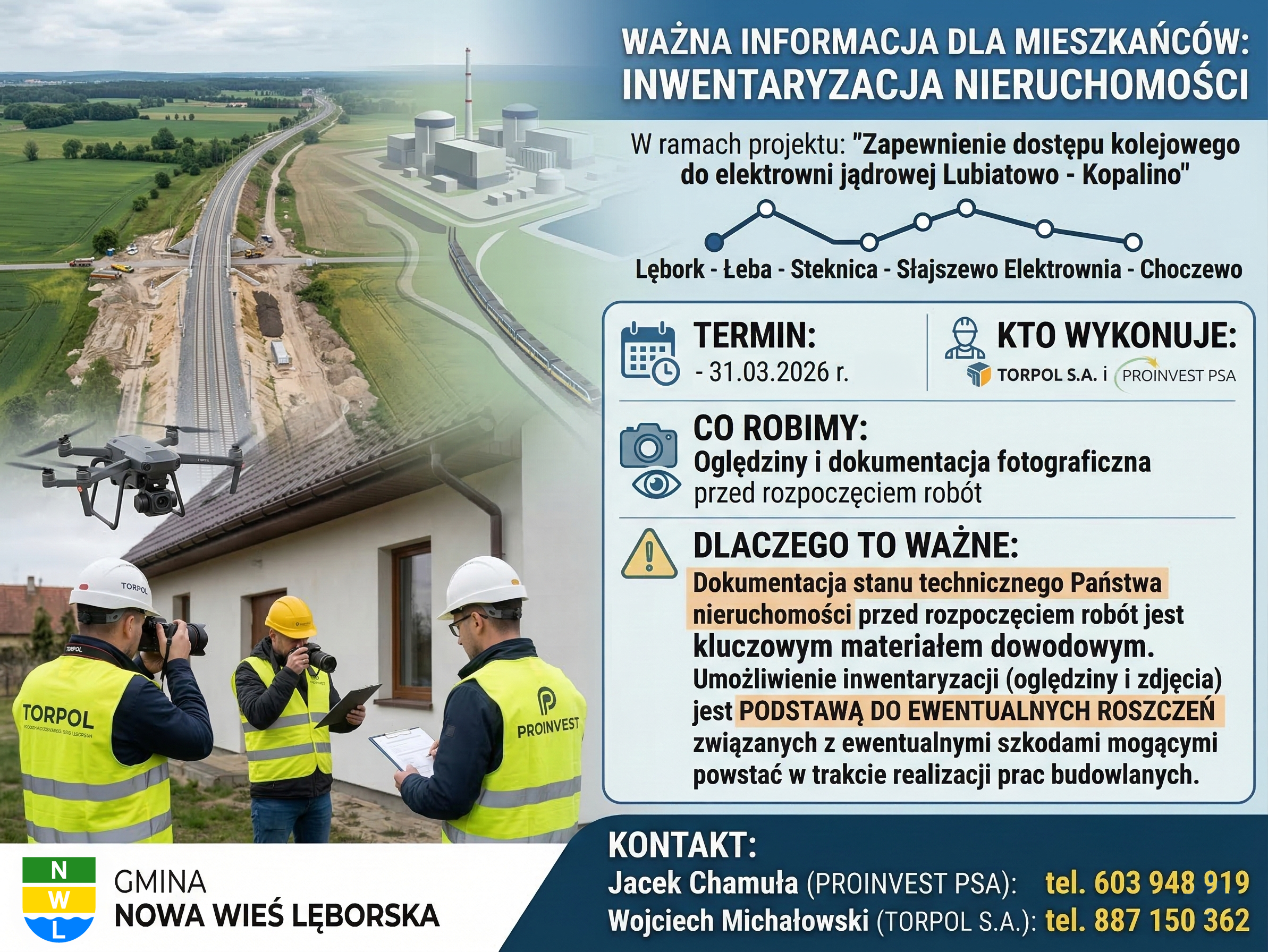 Informujemy, że w związku z realizacją projektu pn.: „Zapewnienie dostępu kolejowego do elektrowni jądrowej Lubiatowo - Kopalino”, wykonawca robót - firma Torpol S.A. - przeprowadza inwentaryzację obiektów budowlanych.