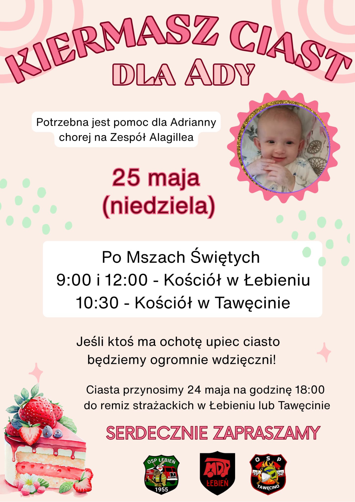 Dochód z kiermaszu zostanie przeznaczony na pomoc dla Adrianny chorej na Zespół Alagille’a – rzadką chorobę genetyczną, wymagającą specjalistycznego leczenia i wsparcia. Każdy może pomóc. Jeśli ktoś chciałby upiec ciasto na kiermasz, będziemy ogromnie wdzięczni. Ciasta należy dostarczyć 24 maja (sobota) o godz. 18:00 do remizy strażackiej w Łebieniu lub Tawęcinie. Dziękujemy za każdy gest wsparcia i serdecznie zapraszamy do udziału w wydarzeniu.