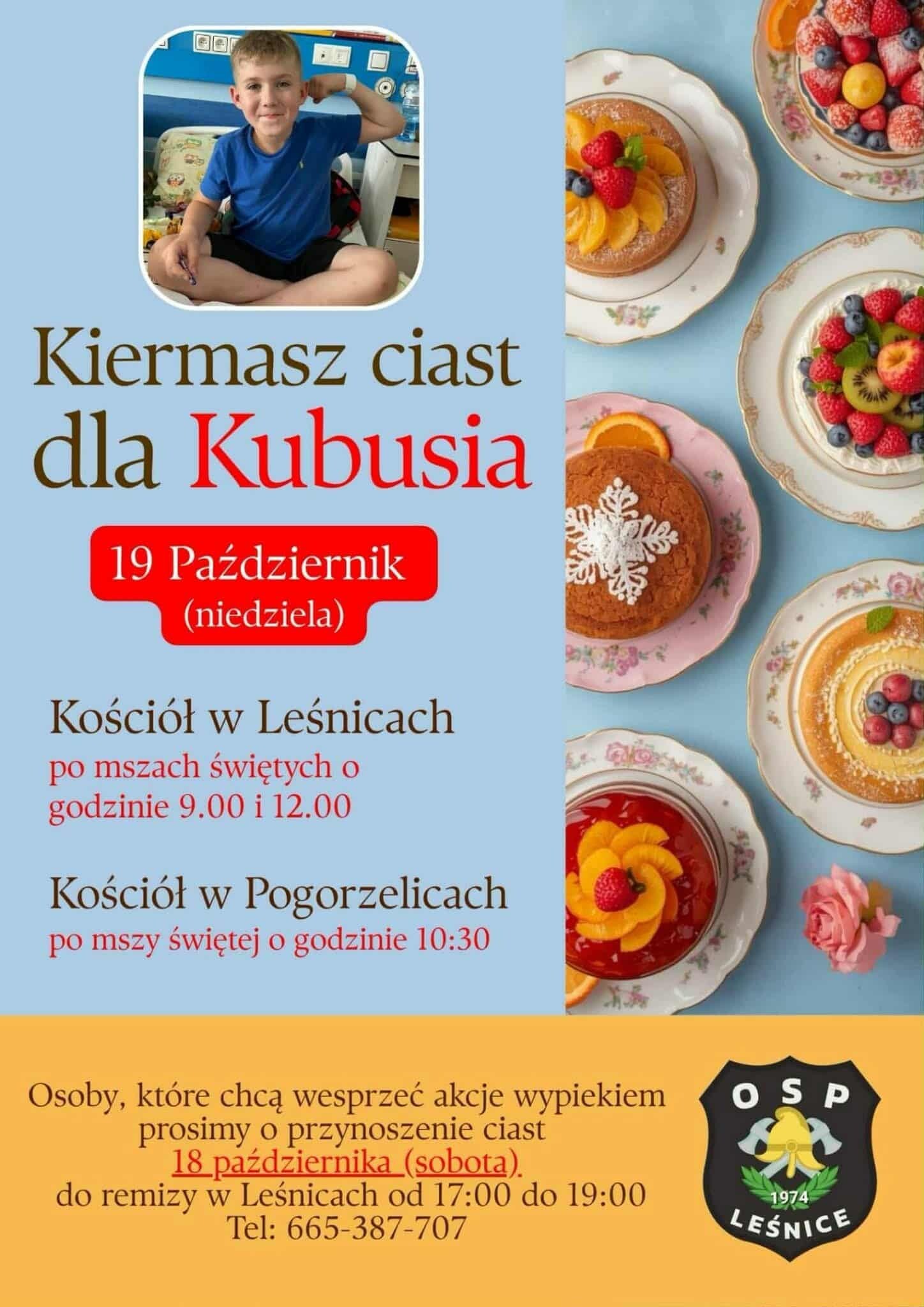 W niedzielę, 19 października, zapraszamy do udziału w wyjątkowym kiermaszu ciast organizowanym na rzecz Kubusia. Nasze wypieki będą czekały na Państwa po mszach świętych w Kościele w Leśnicach (godz. 9:00 i 12:00) oraz w Kościele w Pogorzelicach (po mszy o godz. 10:30).