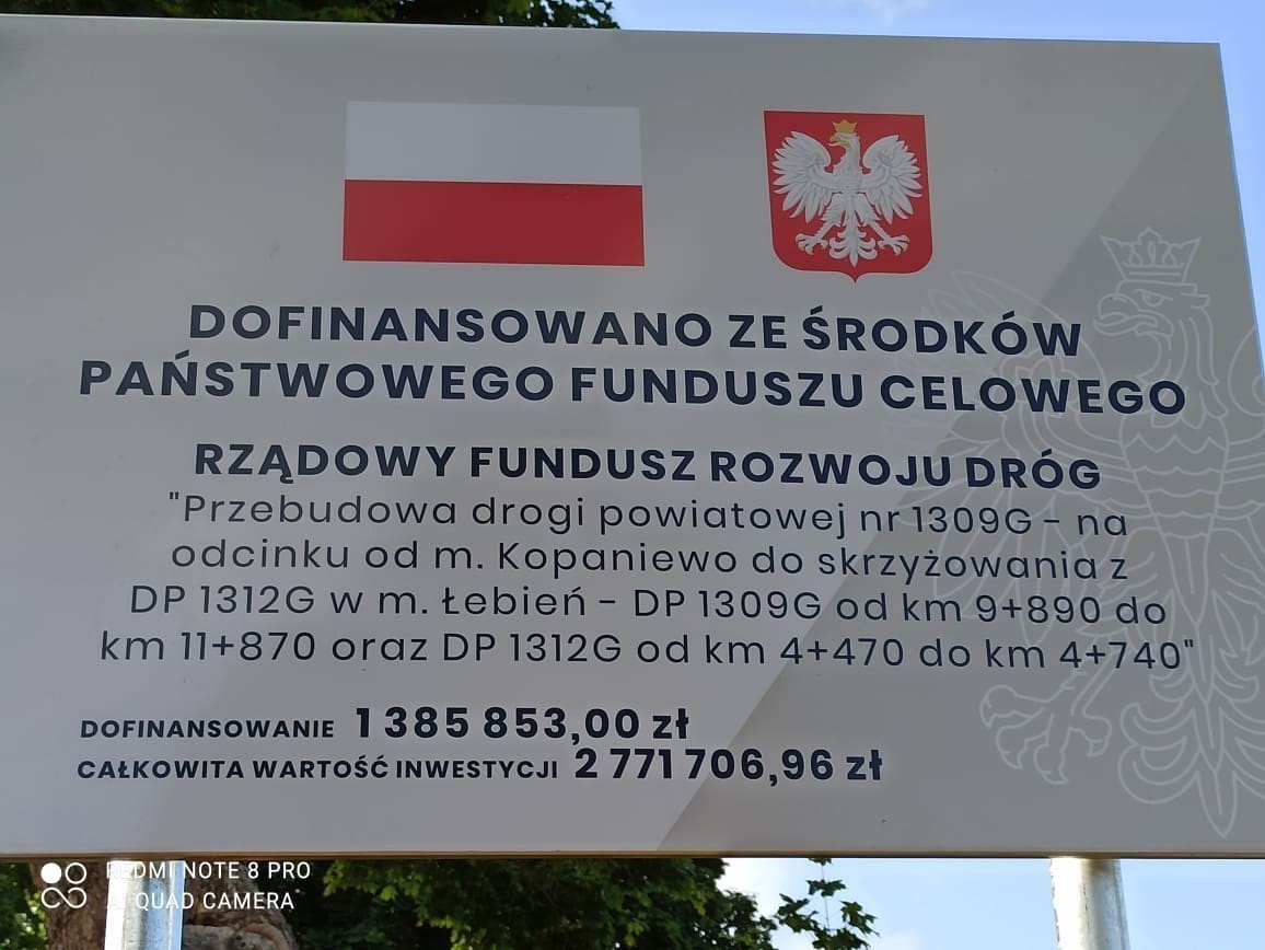 Drugą inwestycją jest przebudowa drogi na odcinku od Kopaniewa do skrzyżowania w Łebieniu. W tym, przypadku roboty prowadzone są na trzech odcinkach o łącznej długości 2.250 m. Zakres robót obejmuje, oprócz przebudowy jezdni asfaltowej, wykonanie 37 utwardzonych zjazdów, 6 przejść dla pieszych, zatok i peronów autobusowych. W ramach inwestycji wykonane zostaną także dwa wyniesione skrzyżowania, odwodnienia liniowe i umocnienia skarp. Całość uzupełni oznakowanie, w tym znaki aktywne oraz 30 szt. tzw. „kocich oczek”, czyli niskoprofilowe oznakowanie odblaskowe typu PEO-2, w znaczący sposób poprawiające bezpieczeństwo szczególnie po zmierzchu i podczas opadów atmosferycznych.