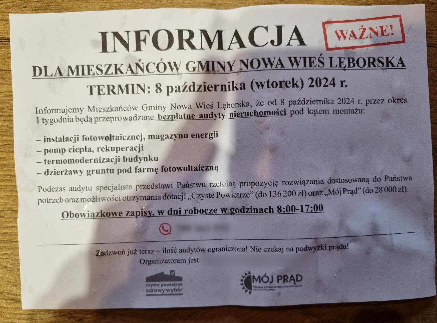 Informujemy, że Gmina Nowa Wieś Lęborska nie prowadzi żadnych działań związanych z audytami dotyczącymi instalacji fotowoltaicznych, pomp ciepła, rekuperacji czy innych form modernizacji energetycznej prywatnych nieruchomości. Prosimy o niezgłaszanie się do urzędu gminy w sprawie tych ogłoszeń. Gmina nie jest organizatorem ani partnerem tych działań.