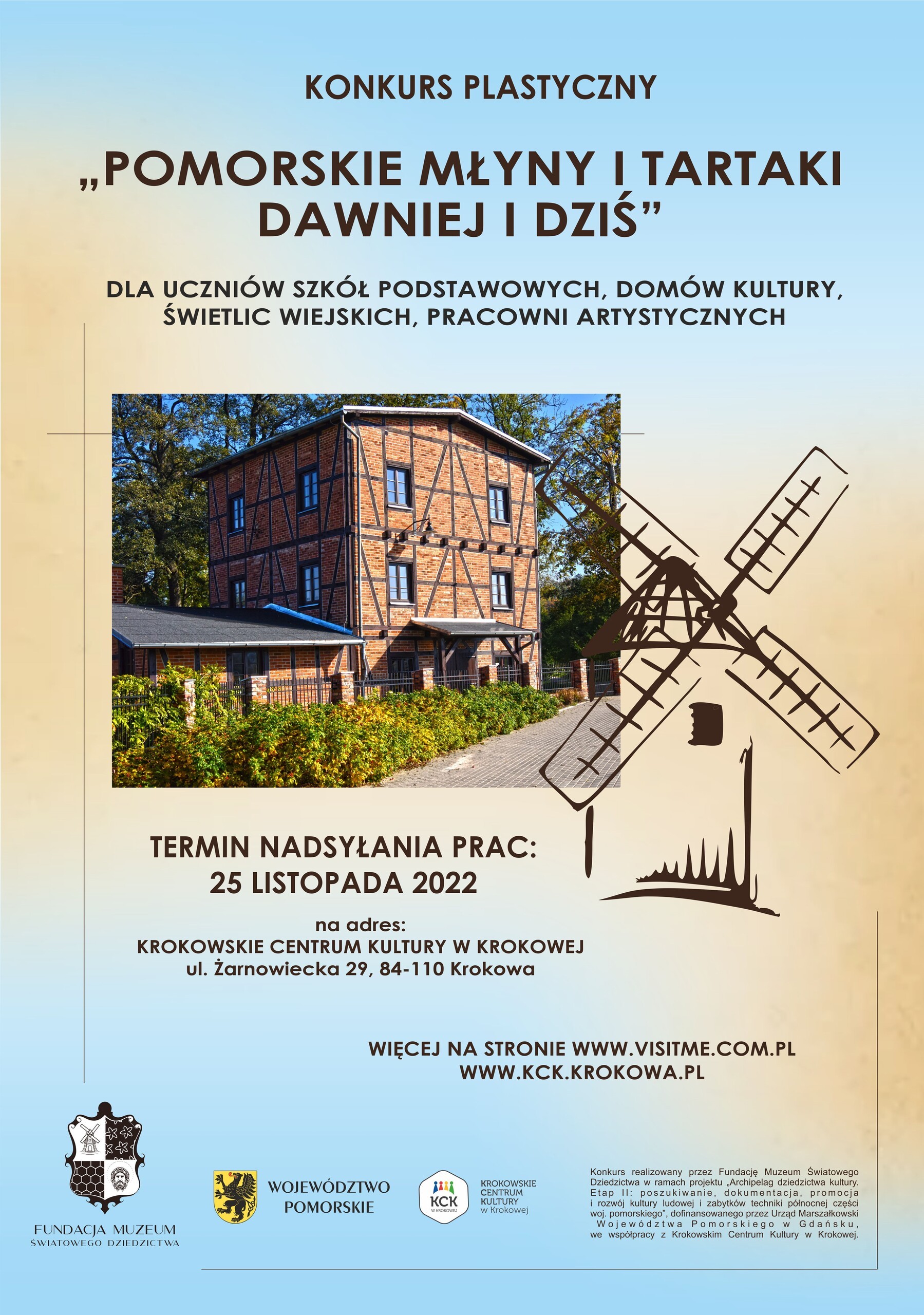 Trwa nabór prac na Konkurs Plastyczny “POMORSKIE MŁYNY I TARTAKI DAWNIEJ I DZIŚ”, organizowany wspólnie przez Fundację Muzeum Światowego Dziedzictwa i Krokowskie Centrum Kultury w Krokowej. Do udziału zapraszamy uczniów szkół podstawowych, domy kultury, świetlice wiejskie, pracownie artystyczne. Termin nadsyłania prac upływa 25 listopada 2022.