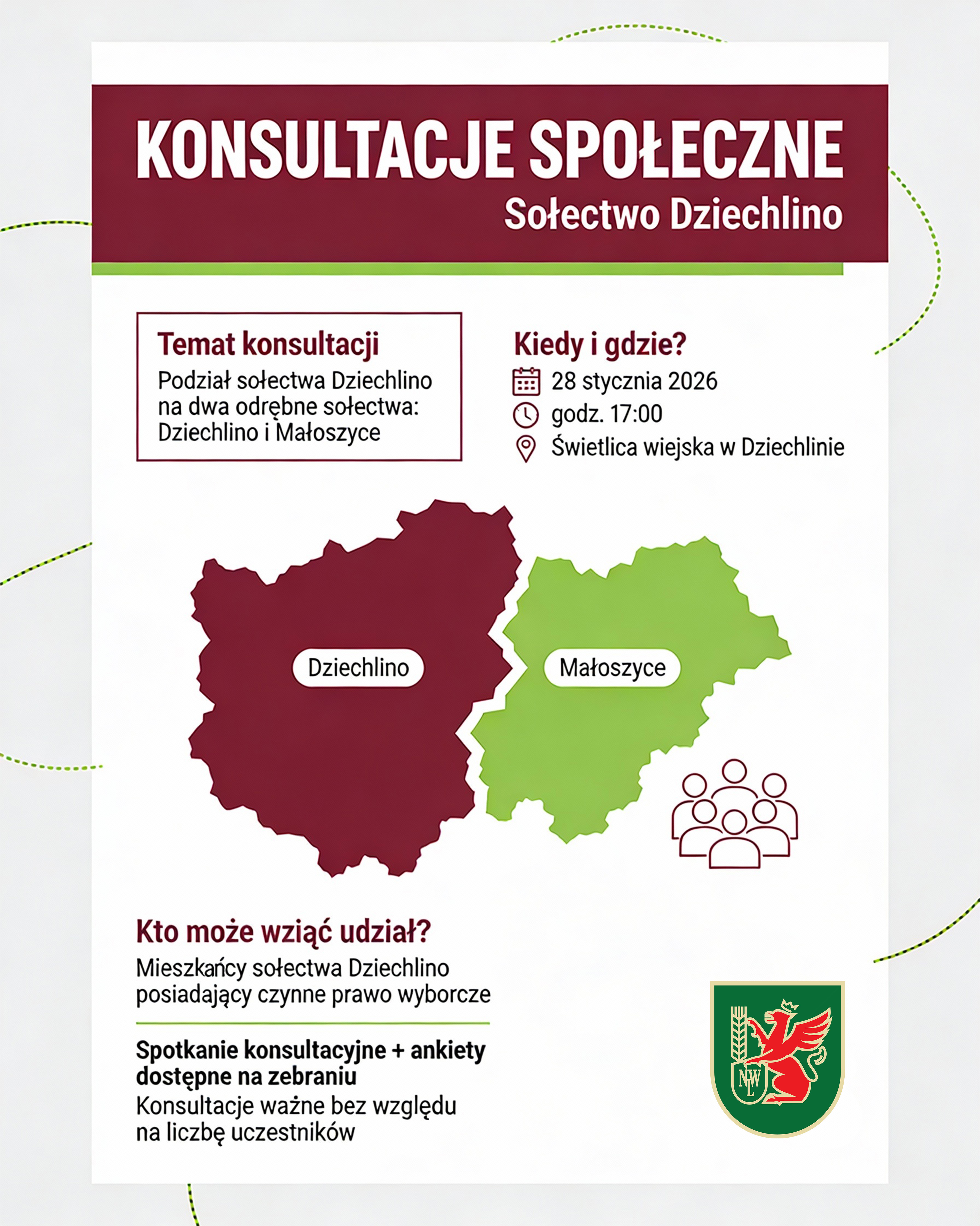 Konsultacje odbędą się 28 stycznia 2026 r. (środa) o godz. 17.00 w świetlicy wiejskiej w Dziechlinie, w formie protokołowanego spotkania konsultacyjnego.