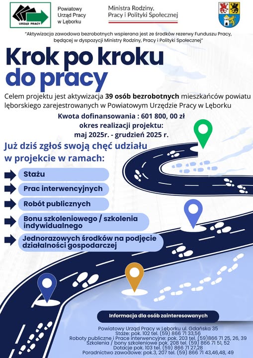 Powiatowy Urząd Pracy w Lęborku realizuje nowy projekt aktywizacyjny pn. „Krok po kroku do pracy”, którego celem jest wsparcie 39 osób bezrobotnych z terenu powiatu lęborskiego, zarejestrowanych w urzędzie pracy.