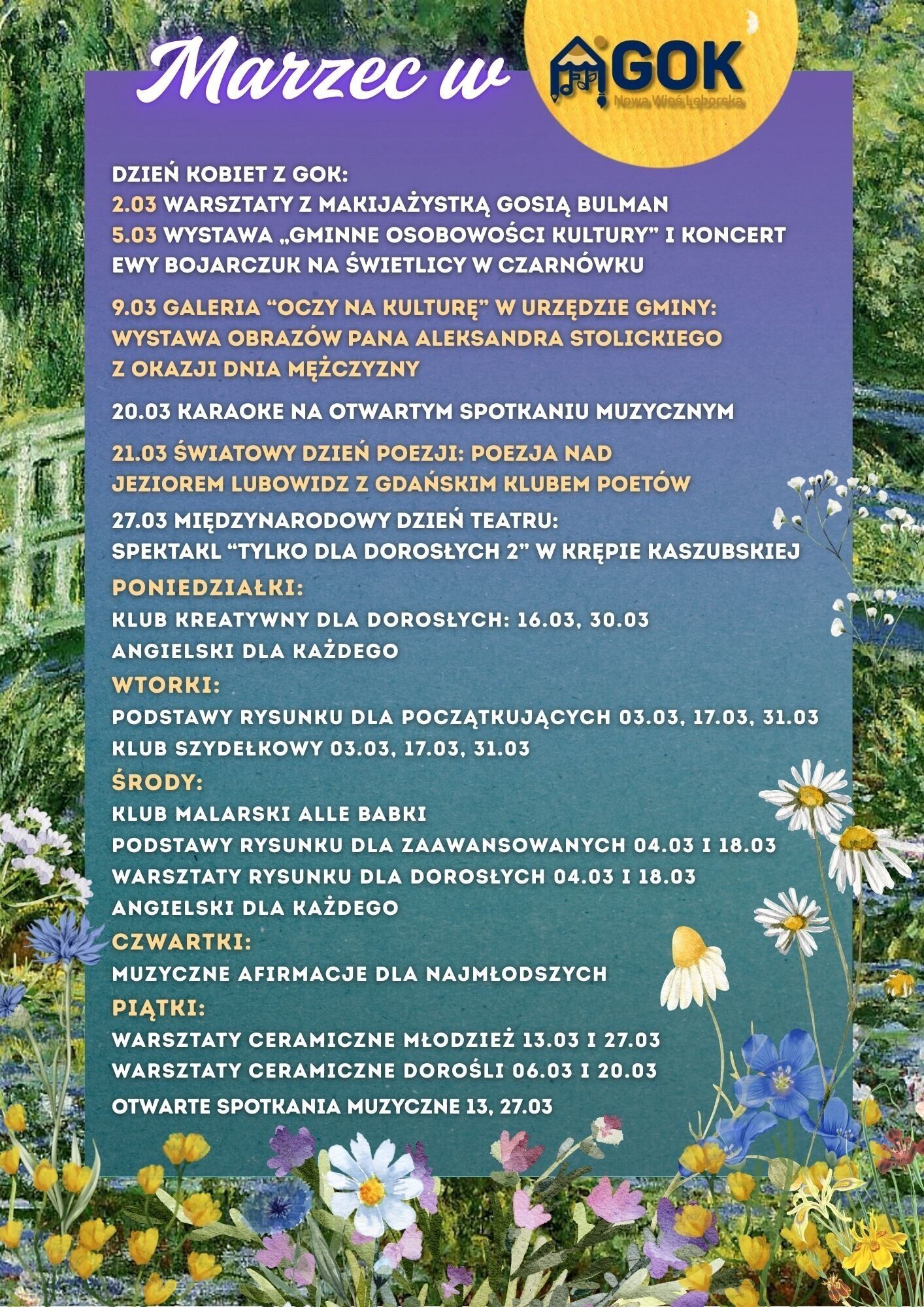 Zapraszamy wszystkich mieszkańców do aktywnego uczestnictwa w wydarzeniach organizowanych przez GOK w marcu. Przygotowaliśmy szeroką ofertę, od spotkań autorskich i wystaw, po warsztaty kreatywne.