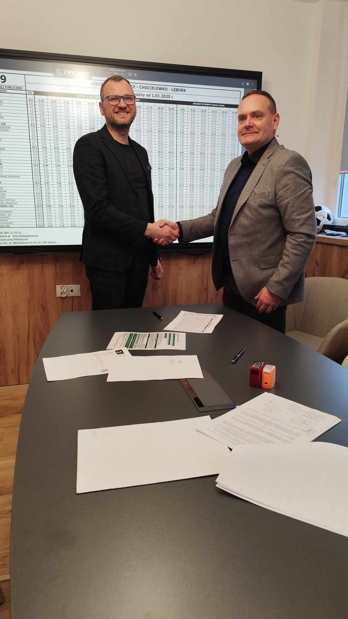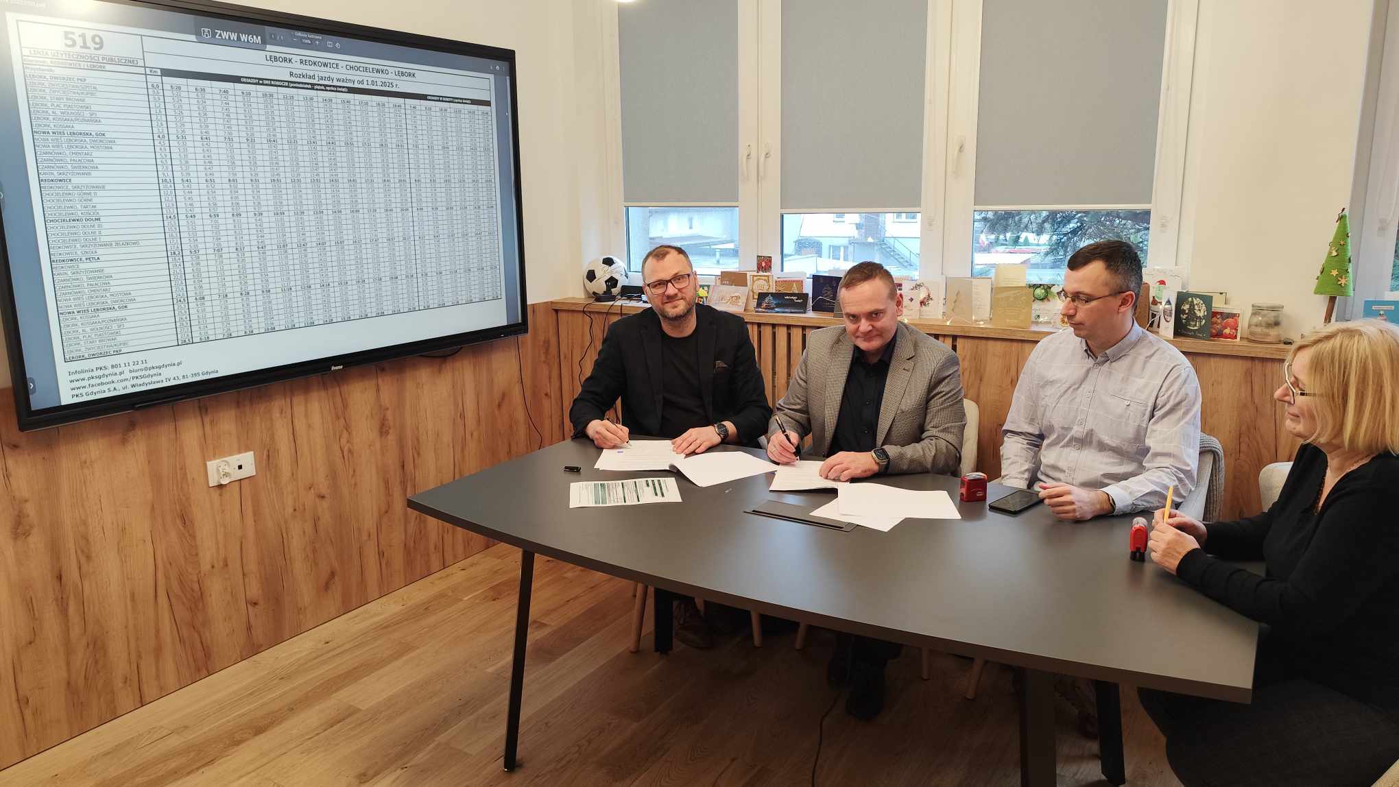 W dniu podpisania umowy, w siedzibie Urzędu Gminy, Wójt Szymon Medalion i Skarbnik Bogusława Gulewicz zawarli porozumienie z przedstawicielami PKS Gdynia: wiceprezesem zarządu Adamem Galasem oraz dyrektorem działu przewozów Pawłem Misiakiem.