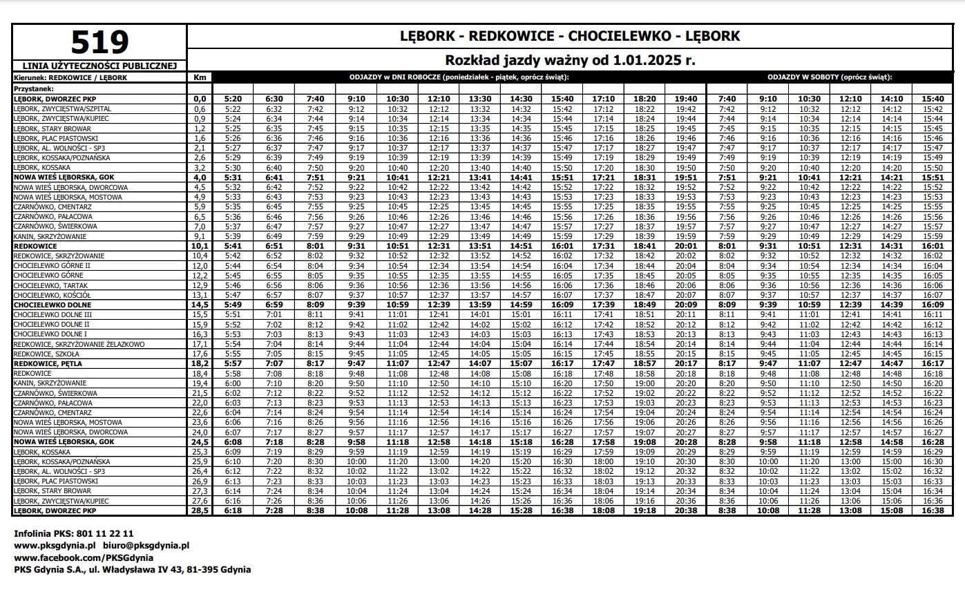 Z początkiem 2025 roku mieszkańcy gminy Nowa Wieś Lęborska zyskają nowe, wygodne połączenie autobusowe dzięki uruchomieniu linii nr 519. Linia ta będzie kursować na trasie Lębork – Redkowice przez Nową Wieś Lęborską, Czarnówko i Chocielewko, przejmując trasę dotychczasowej linii miejskiej nr 3 obsługiwanej przez ZKM Lębork.