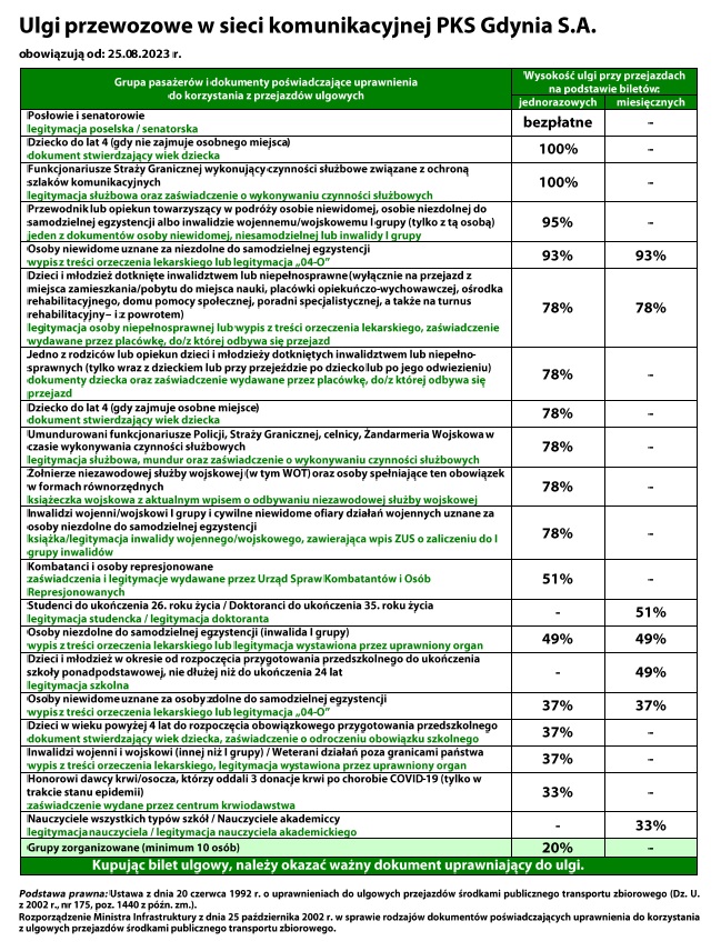 - Ulgi na bilety jednorazowe dla uczniów, studentów, emerytów i rencistów.