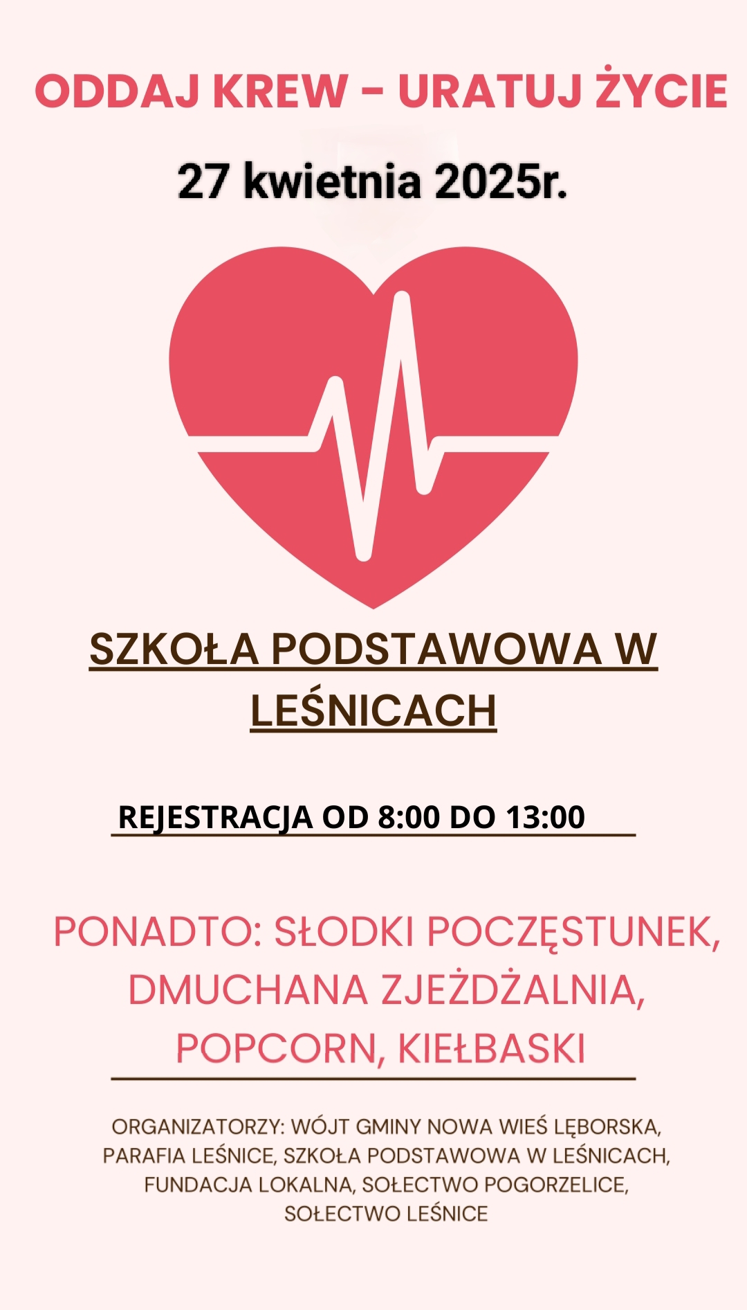 Serdecznie zapraszamy mieszkańców gminy Nowa Wieś Lęborska oraz okolic do udziału w wyjątkowej akcji krwiodawstwa, która odbędzie się 27 kwietnia 2025 roku (niedziela) w Szkole Podstawowej w Leśnicach.