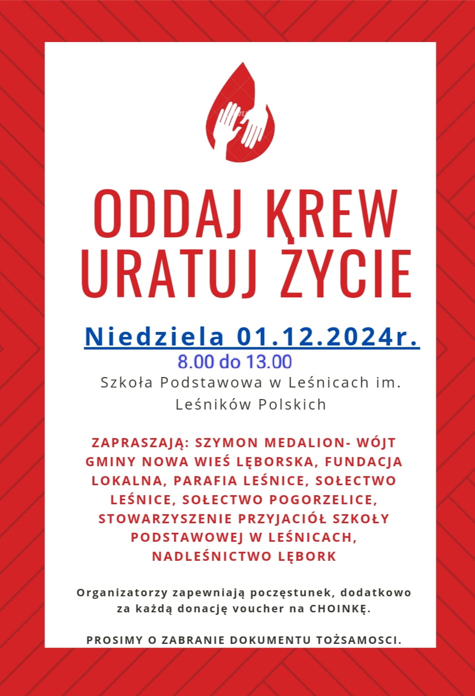 Serdecznie zapraszamy na akcję honorowego krwiodawstwa, która odbędzie się w niedzielę, 1 grudnia 2024 roku, w godzinach od 8:00 do 13:00 w Szkole Podstawowej w Leśnicach im. Leśników Polskich.