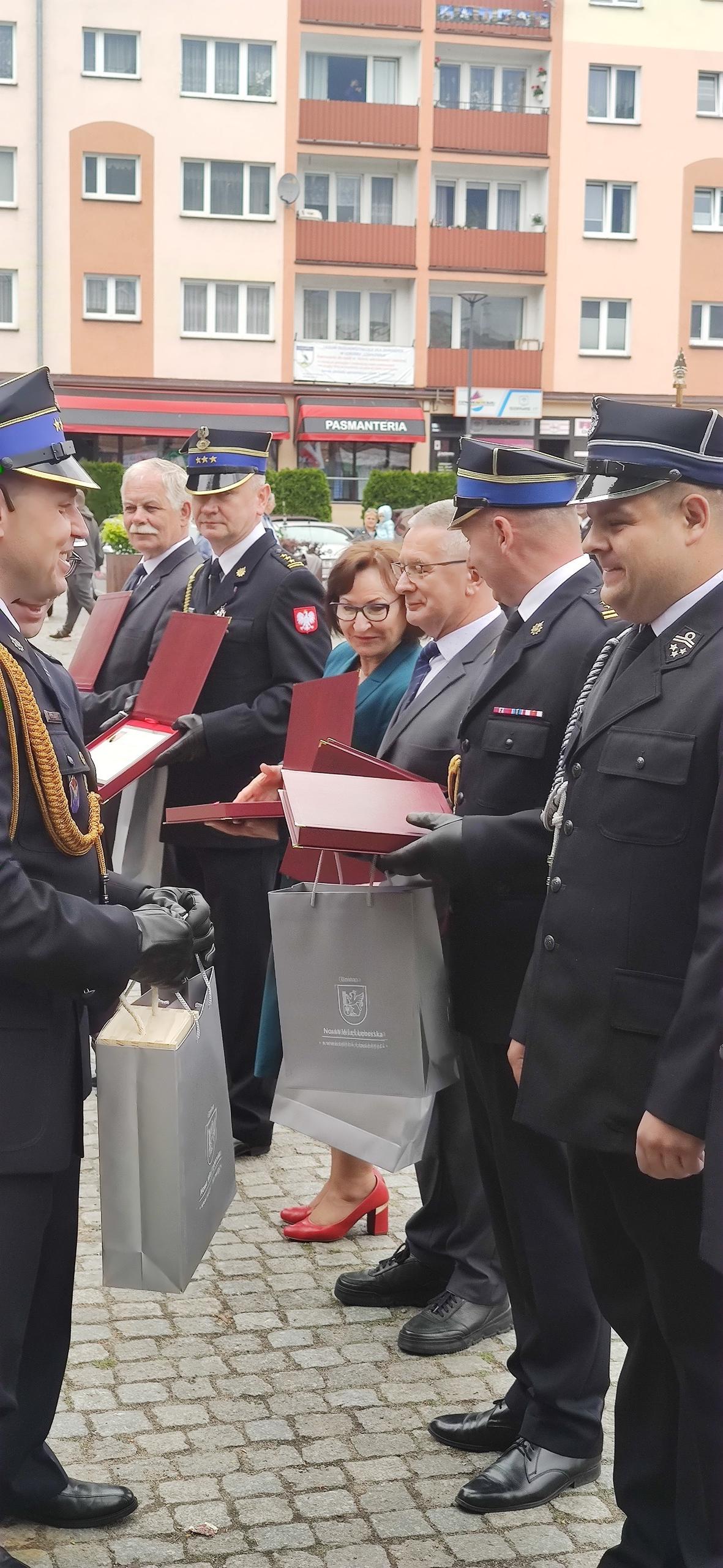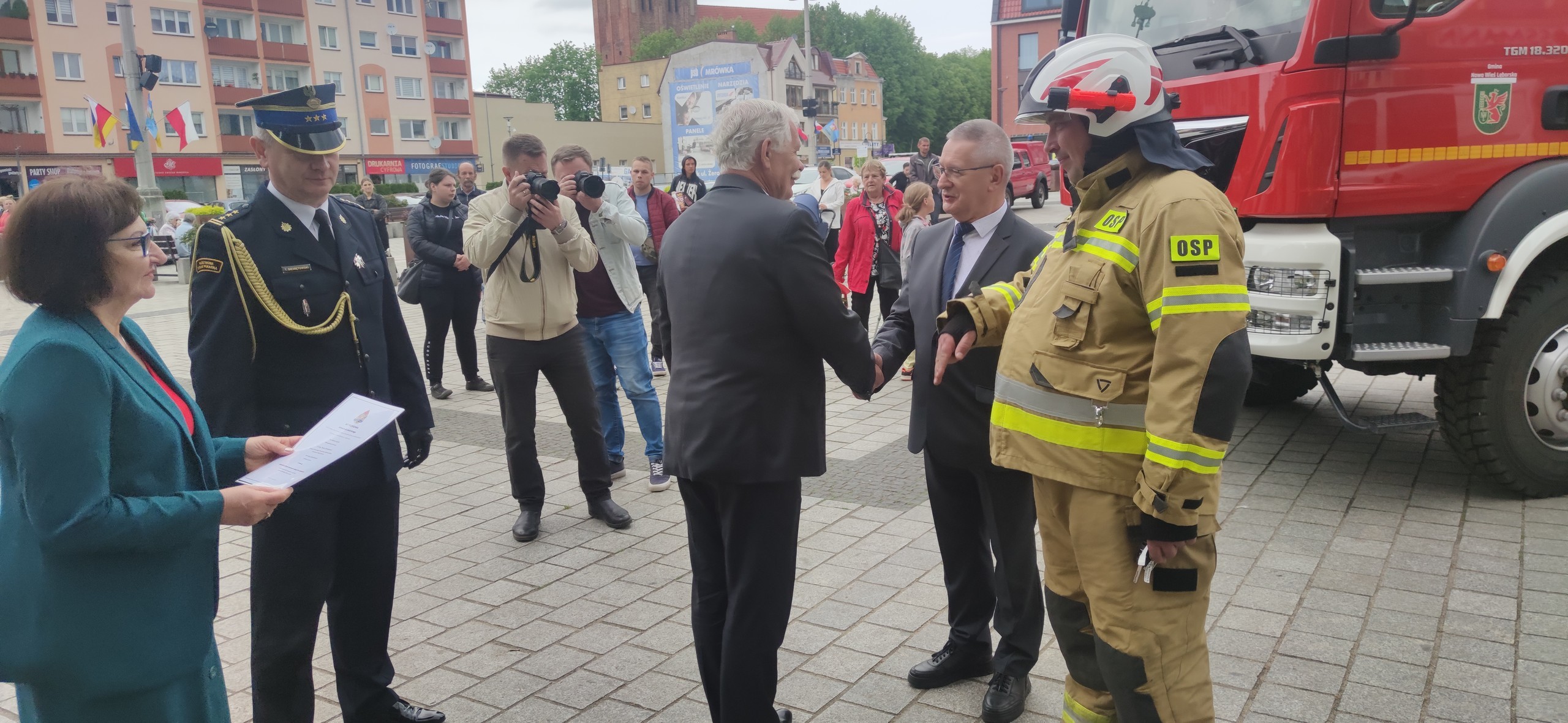 Na koniec uroczystości druhowie Ochotniczej Straży Pożarnej w Nowej Wsi Lęborskiej oficjalnie podziękowali Wojewodzie, przedstawicielom Państwowej Straży Pożarnej, władzom samorządowym oraz najbardziej zaangażowanym strażakom OSP za pomoc w zakupie nowego samochodu bojowego.