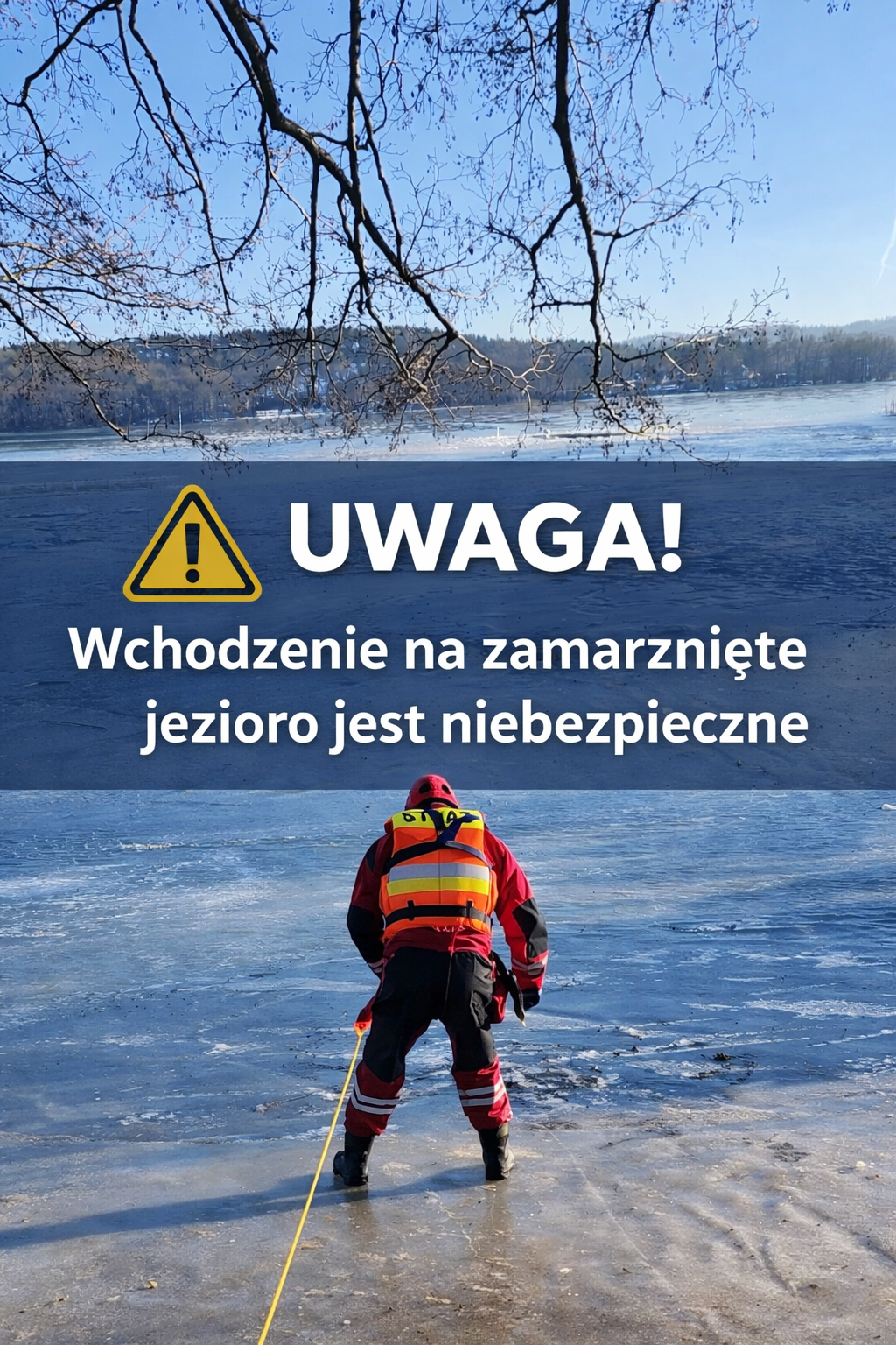 Apelujemy o niewchodzenie na zamarzniętą taflę jeziora oraz o zachowanie szczególnej ostrożności. Prosimy rodziców i opiekunów o rozmowy z dziećmi i młodzieżą na temat zagrożeń związanych z przebywaniem na lodzie.