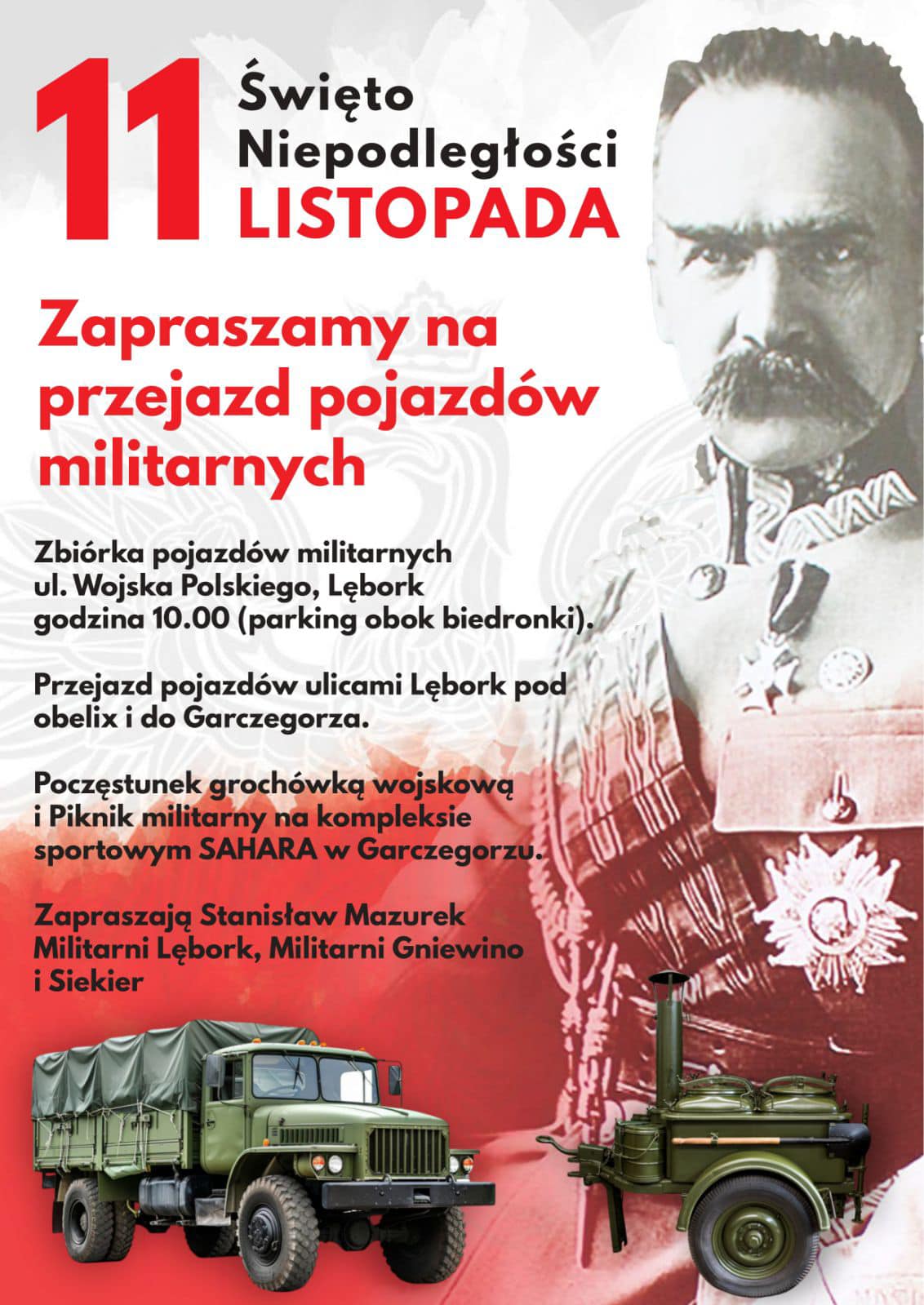 W imieniu organizatorów zapraszamy na wyjątkowe wydarzenie organizowane z okazji 11 listopada! O godzinie 10:00 na parkingu przy ul. Wojska Polskiego w Lęborku zbiorą się pojazdy militarne, aby wspólnie uczcić Narodowe Święto Niepodległości.