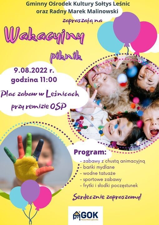 Gminny Ośrodek Kultury w Nowej Wsi Lęborskiej, Sołtys Leśnic oraz radny Marek Malinowski zapraszają na WAKACYJNY PIKNIK w Leśnicach 9 sierpnia od godziny 11:00.