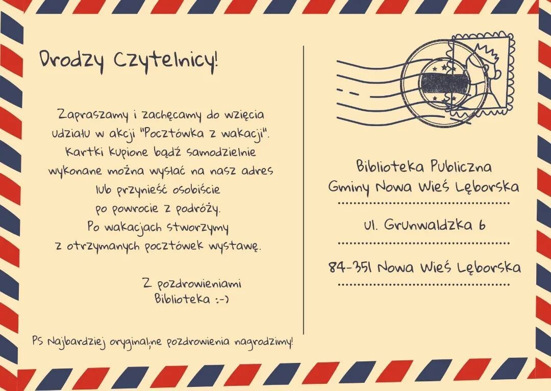 Biblioteka Publiczna Gminy Nowa Wieś Lęborska zaprasza i zachęca do udziału w akcji wakacyjnej "Pocztówka z wakacji".