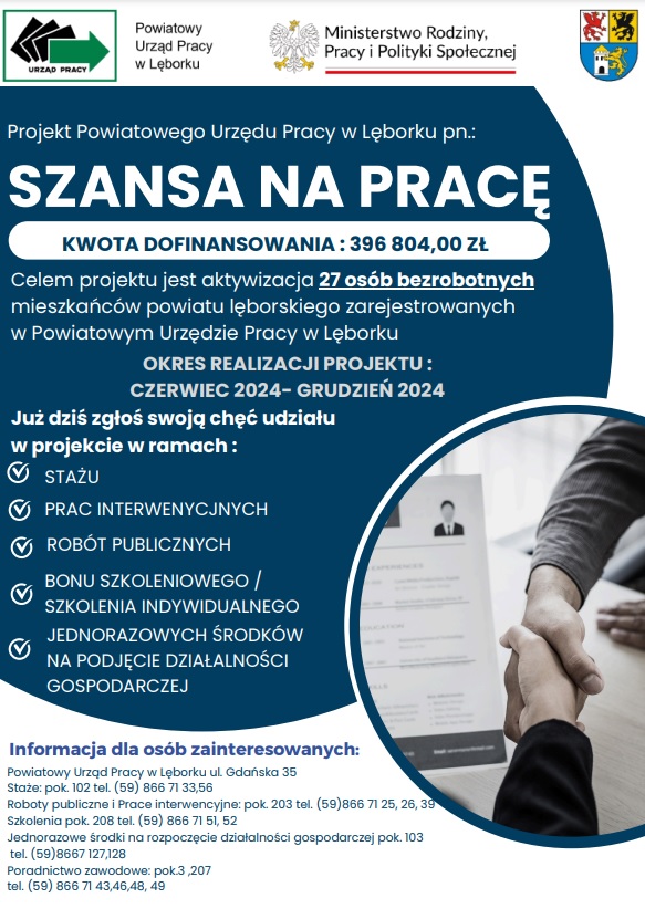 Powiatowy Urząd Pracy w Lęborku realizuje projekt „Szansa na pracę”, mający na celu aktywizację zawodową bezrobotnych. Dzięki dofinansowaniu w wysokości 396 804 zł z Funduszu Pracy, projekt skierowany jest do 27 osób.