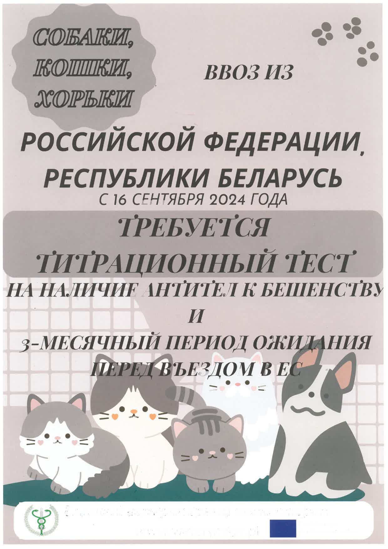 Od 16 września 2024 roku wprowadzono nowe przepisy dotyczące przewozu psów, kotów i fretek z Federacji Rosyjskiej oraz Republiki Białorusi do Unii Europejskiej. Wymagane jest przeprowadzenie badania miareczkowania poziomu przeciwciał przeciwko wściekliźnie. Dodatkowo, obowiązuje 3-miesięczny okres oczekiwania przed wjazdem do UE. Prosimy o przestrzeganie nowych regulacji.
