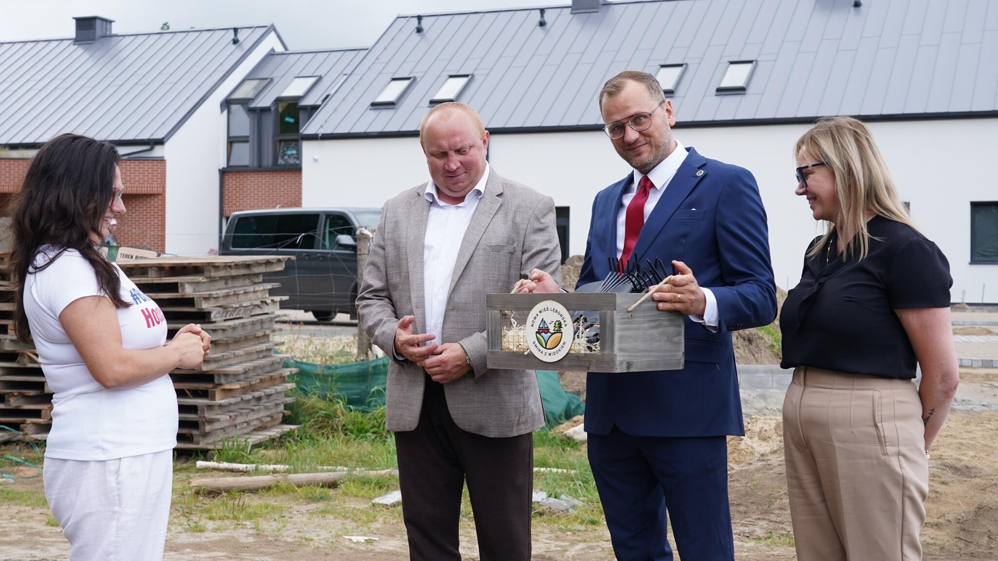„To symboliczne podziękowanie za Waszą ciężką pracę i oddanie, jakie wkładacie w to miejsce. Po zakończeniu budowy te narzędzia z pewnością przydadzą się do pielęgnacji przyszłego ogrodu wokół budynku. Jestem pewny, że hospicjum będzie wizytówką naszej gminy” – powiedział Wójt Szymon Medalion, wręczając upominek.