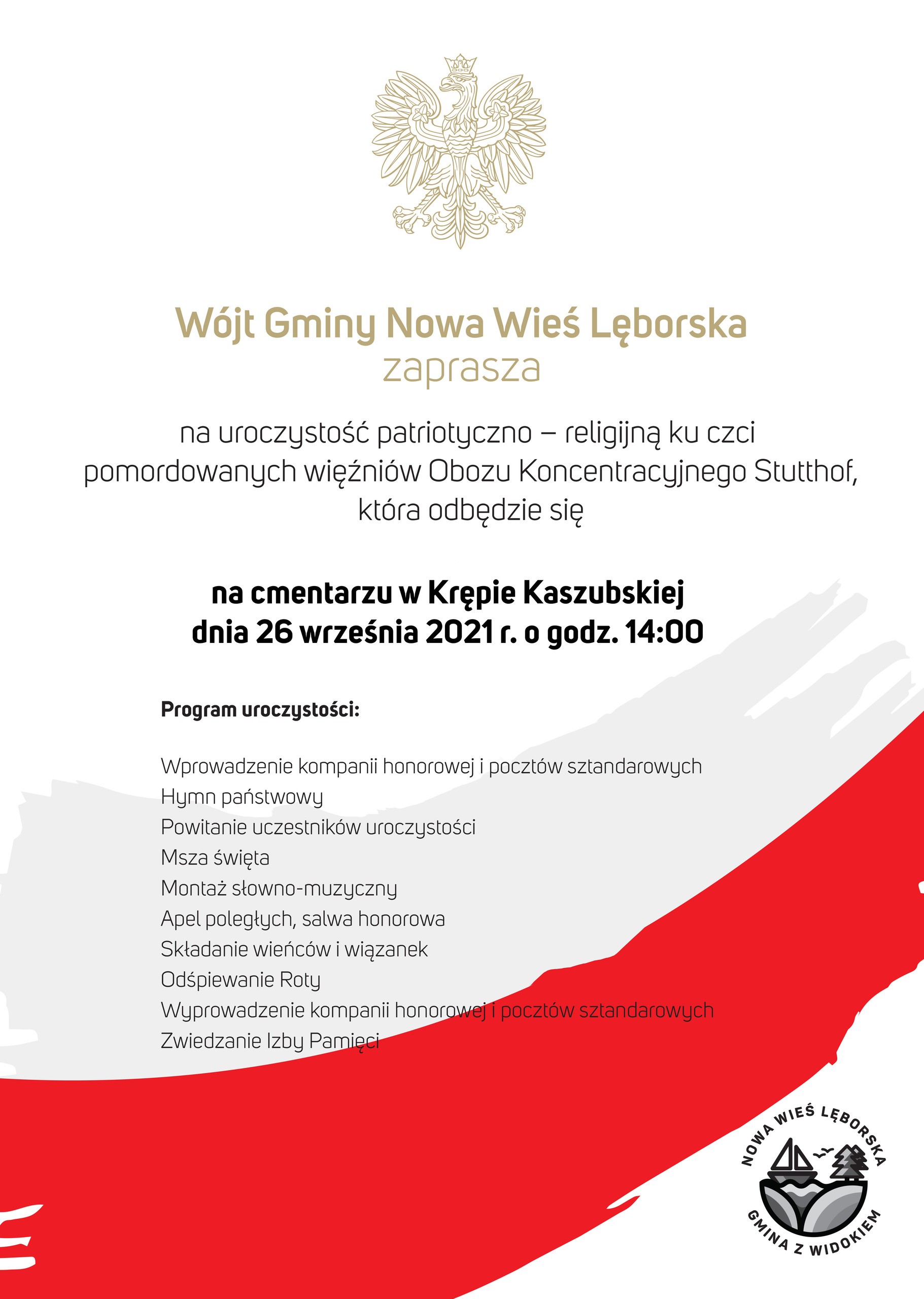 Wójt Gminy Nowa Wieś Lęborska zaprasza na uroczystość patriotyczno-religijną ku czci pomordowanych więźniów Obozu Koncentracyjnego Stutthof, która odbędzie się na cmentarzu w Krępie Kaszubskiej dnia 26 września 2021 r. o godzinie 14:00.