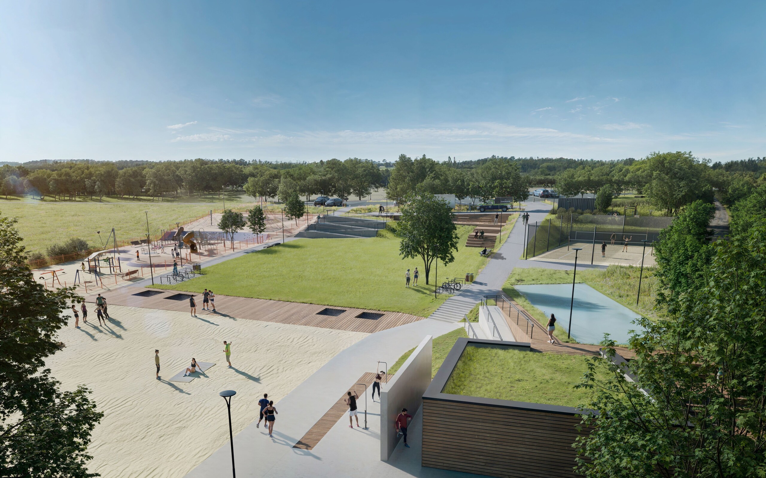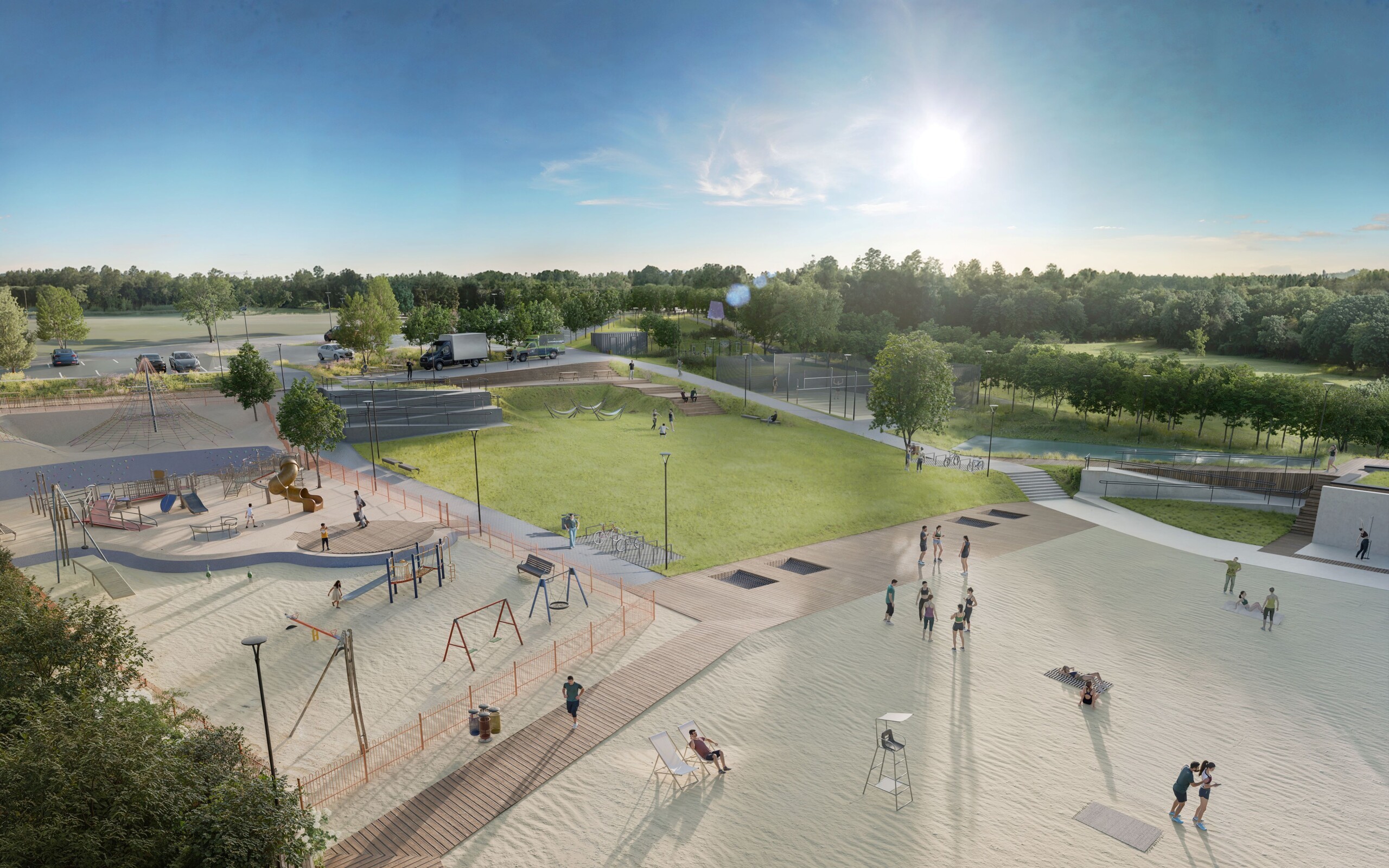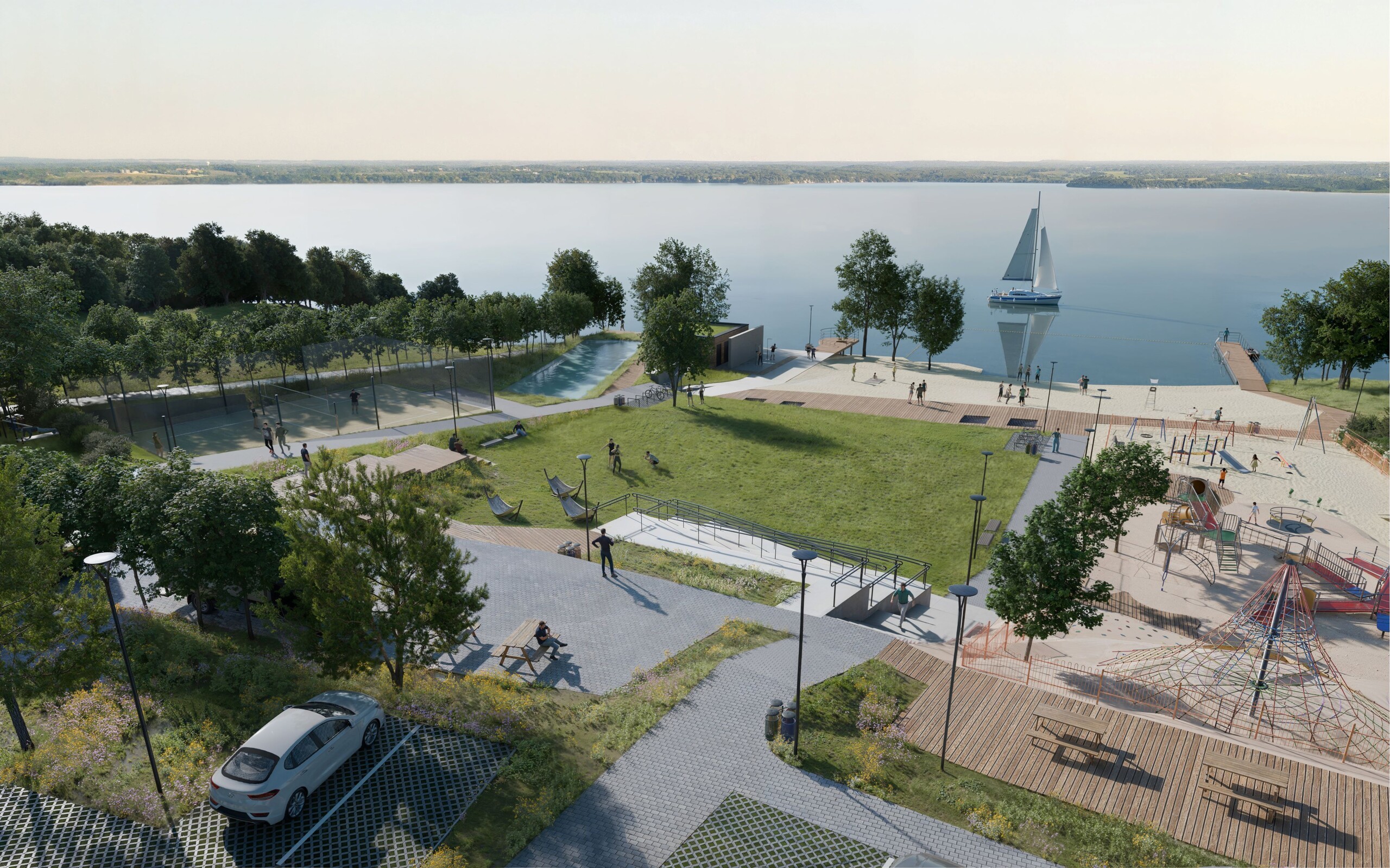 Nie zabraknie też infrastruktury wodnej: planowane są wieża ratownika, teren do pływania ograniczony bojkami oraz pomost. Całość inwestycji uzupełni nowoczesna infrastruktura komunikacyjna, w tym parking, ścieżki, ciągi komunikacyjne oraz przestrzenie przeznaczone na organizację wydarzeń i food trucki.