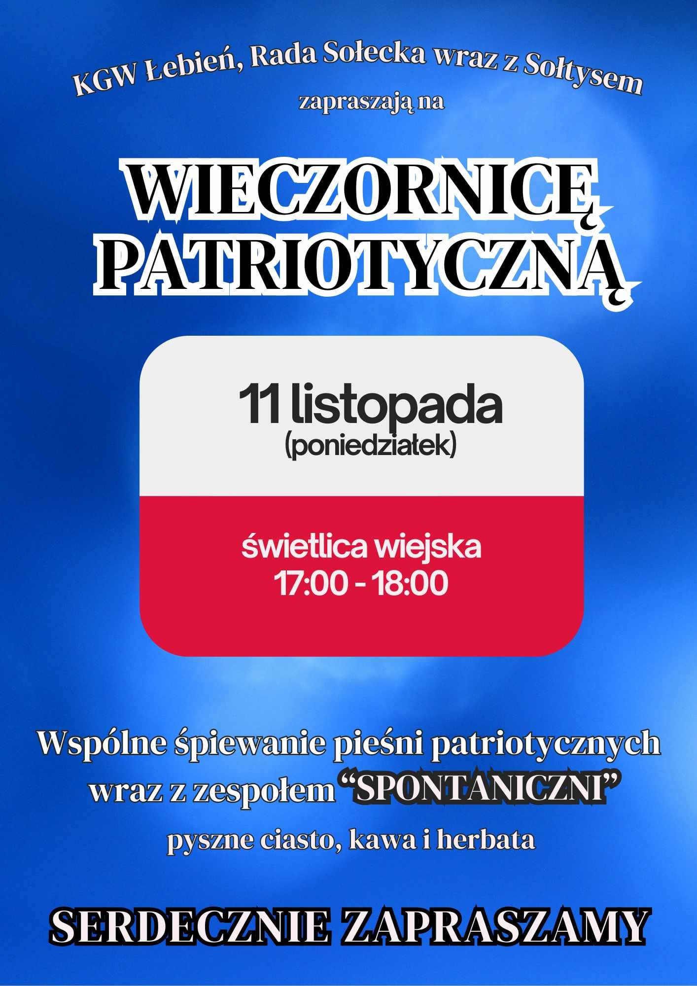 11 listopada o godzinie 17:00 w świetlicy wiejskiej w Łebieniu odbędzie się Wieczornica Patriotyczna. W programie wspólne śpiewanie pieśni patriotycznych z zespołem "SPONTANICZNI", a na uczestników czeka kawa, herbata i pyszne ciasto. Zapraszamy w imieniu organizatorów: KGW Łebień, Rady Sołeckiej Sołectwa Łebień i Sołtysa.