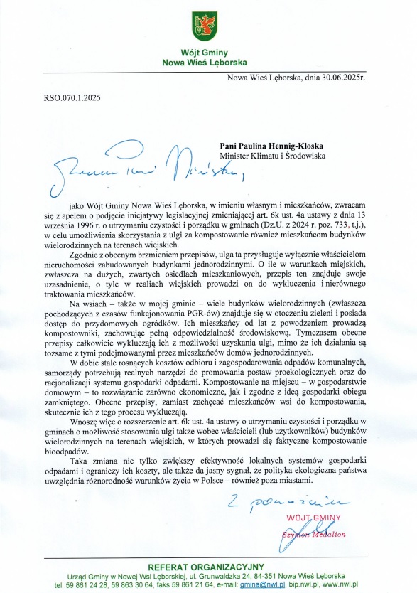 Wójt Gminy skierował oficjalne pismo do Minister Klimatu i Środowiska, Pani Pauliny Hennig-Kloski, w którym zaapelował o zmianę przepisów dotyczących ulg za kompostowanie bioodpadów.