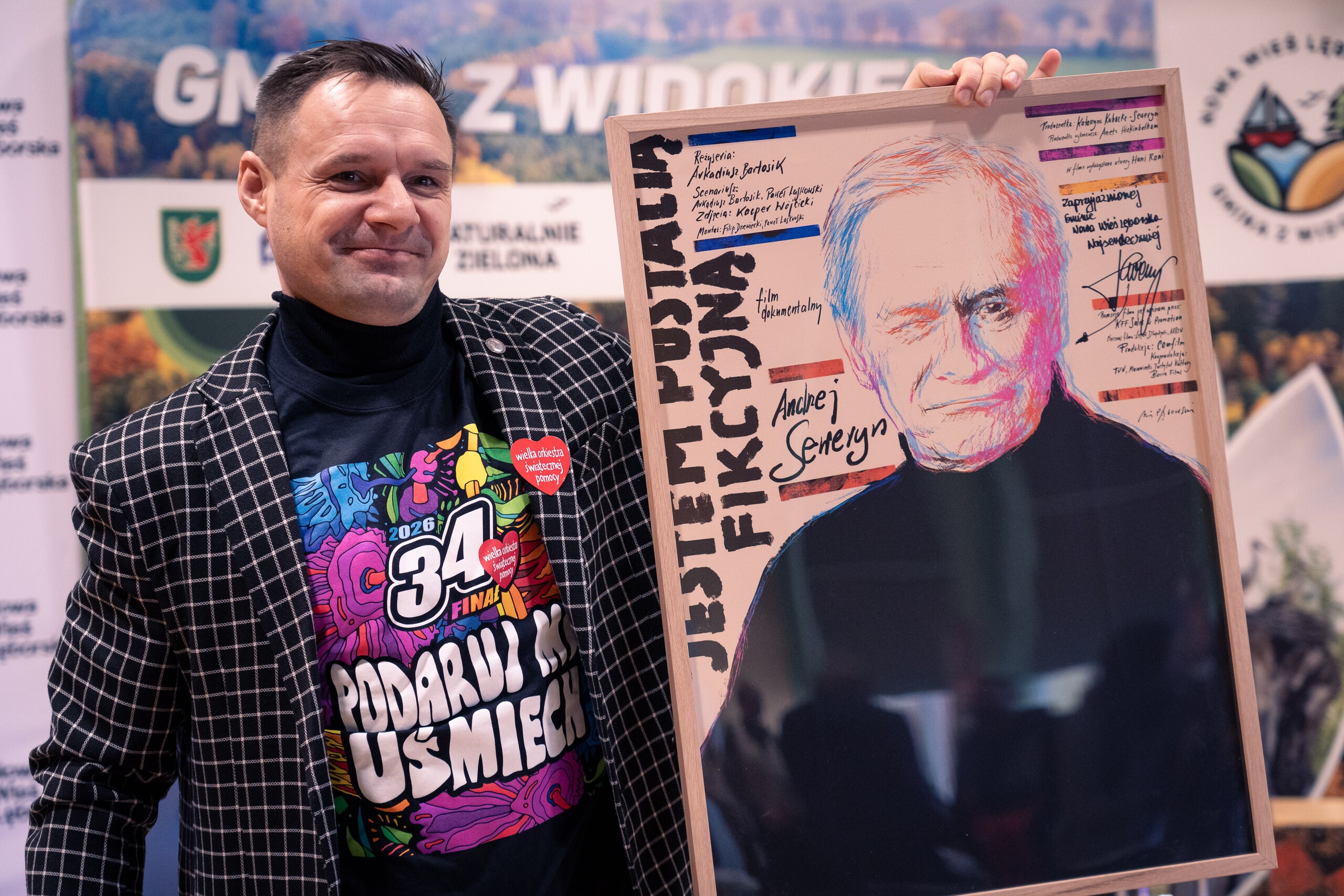- plakat z filmu „Jestem postacią fikcyjną” z autografem Andrzeja Seweryna,