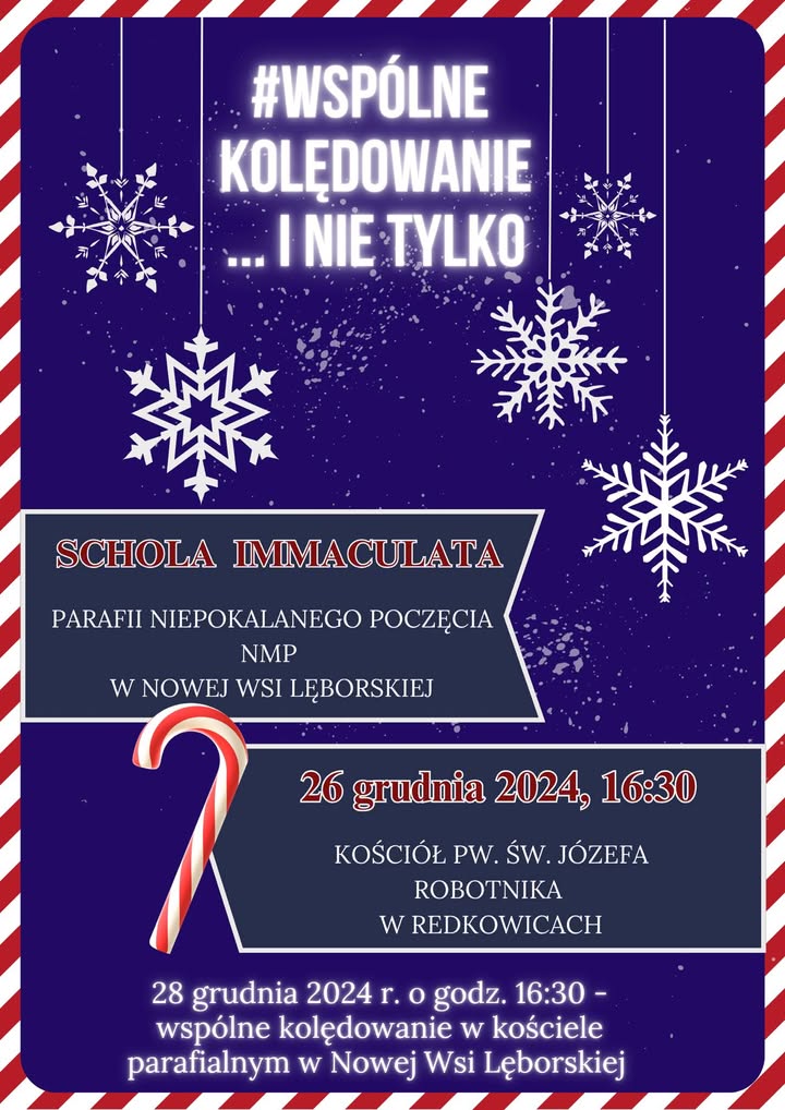 - 28 grudnia 2024, godz. 16:30 – wspólne kolędowanie w Kościele Parafialnym w Nowej Wsi Lęborskiej.