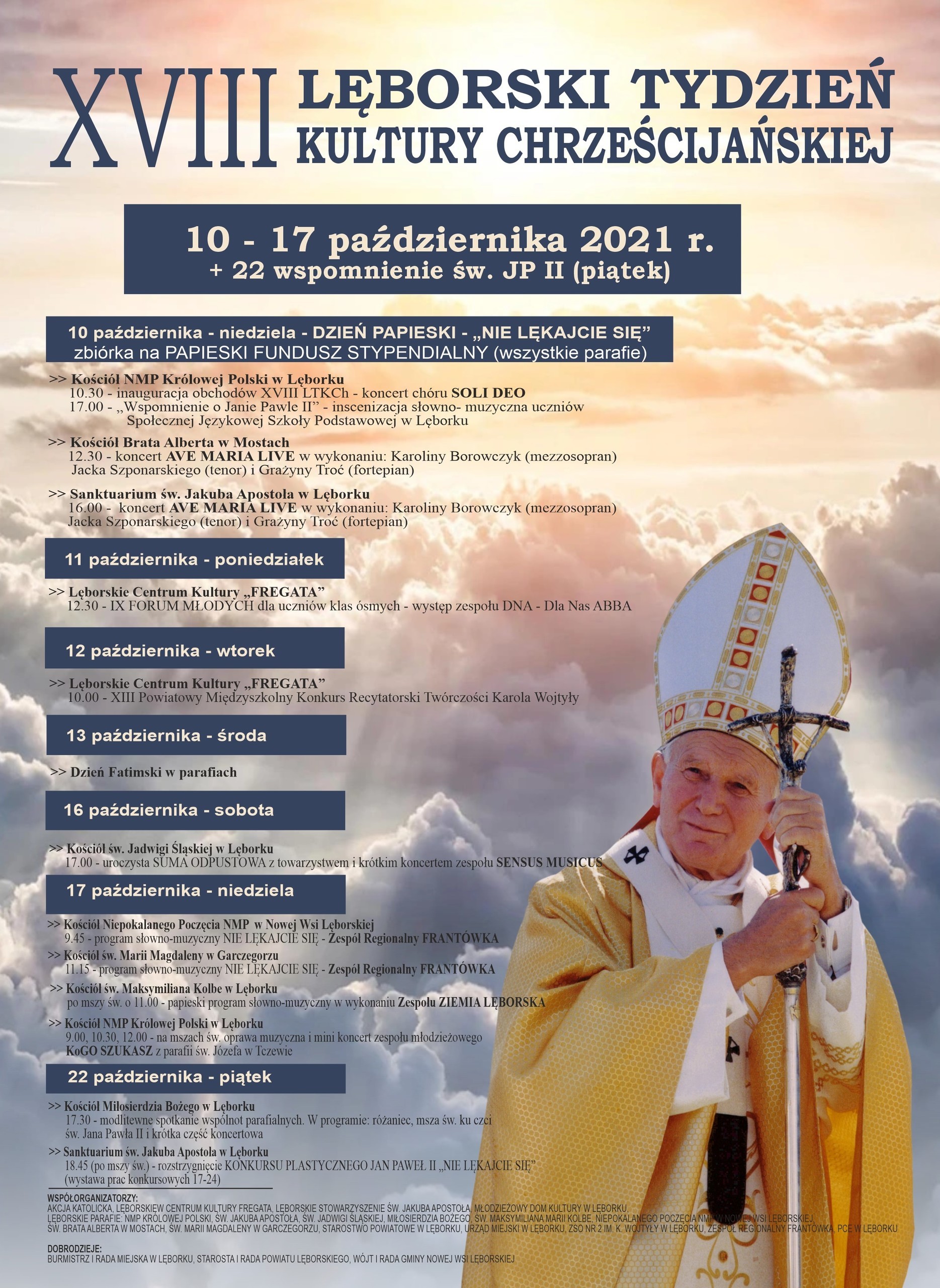 Współorganizatorzy: AKCJA KATOLICKA, LĘBORSKIE CENTRUM KULTURY FREGATA, LĘBORSKIE STOWARZYSZENIE ŚW. JAKUBA APOSTOŁA, MŁODZIEŻOWY DOM KULTURY W LĘBORKU, LĘBORSKIE PARAFIE: NMP KRÓLOWE POLSKI, ŚW. JAKUBA APOSTOŁA, ŚW. JADWIGI ŚLĄSKIEJ,MIŁOSIERDZIA BOŻEGO, ŚW.MAKSYMILIANA MARII KOLBEGO, NIEPOKALANEGO POCZĘCIA NMP w NOWEJ WSI LĘBORSKIEJ, ŚW. BRATA ALBERTA, w MOSTACH, ŚW. MARII MAGDALENY w GARCZEGORZU, STAROSTWO POWIATOWE w LĘBORKU, URZĄD MIEJSKI w LĘBORKU, ZESPÓŁ SZKÓŁ OGÓLNOKSZTAŁCĄCYCH NR 2 IM. KAROLA WOJTYŁY w LĘBORKU, ZESPÓŁ REGIONALNY FRANTÓWKA. POWIATOWE CENTRUM EDUKACYJNE w LĘBORKU