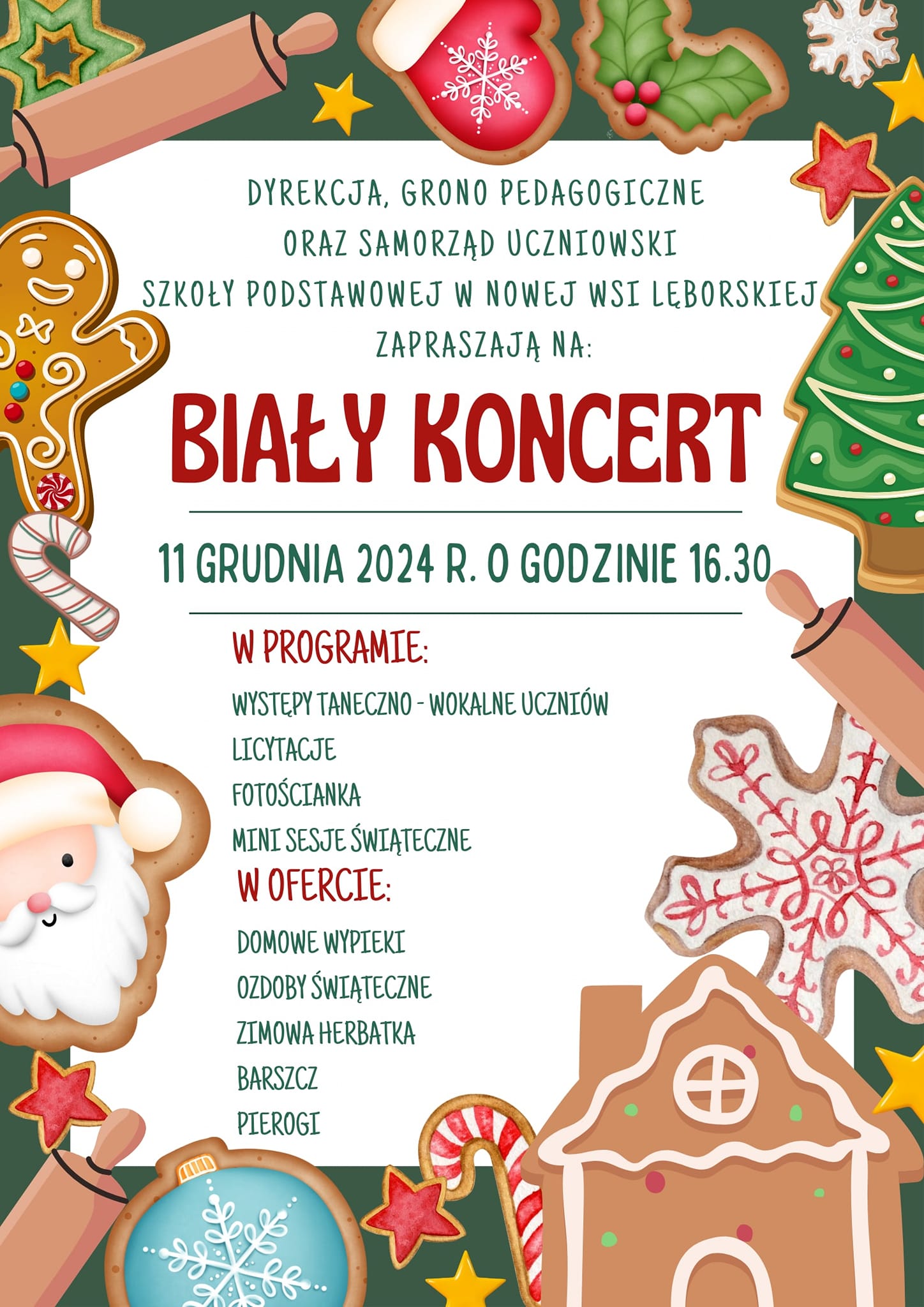 Dyrekcja, grono pedagogiczne oraz samorząd uczniowski Szkoły Podstawowej w Nowej Wsi Lęborskiej serdecznie zapraszają na Biały Koncert, który odbędzie się 11 grudnia 2024 roku o godzinie 16:30 w budynku szkoły.