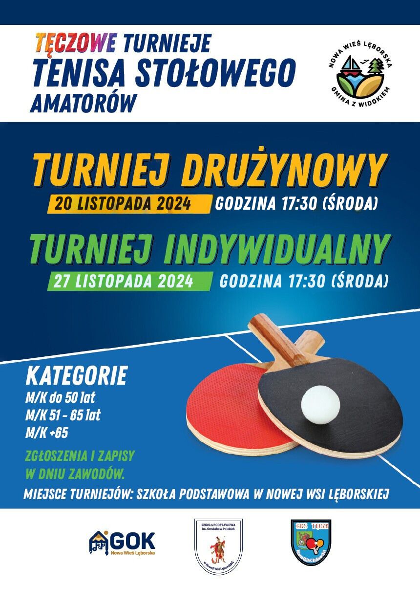 Serdecznie zapraszamy mieszkańców do udziału w nadchodzących turniejach tenisa stołowego dla amatorów! W ramach promocji zdrowego stylu życia oraz integracji lokalnej społeczności, w Szkole Podstawowej w Nowej Wsi Lęborskiej odbędą się dwa turnieje: indywidualny i drużynowy, które stanowią doskonałą okazję do sportowej rywalizacji i wspólnej zabawy.
