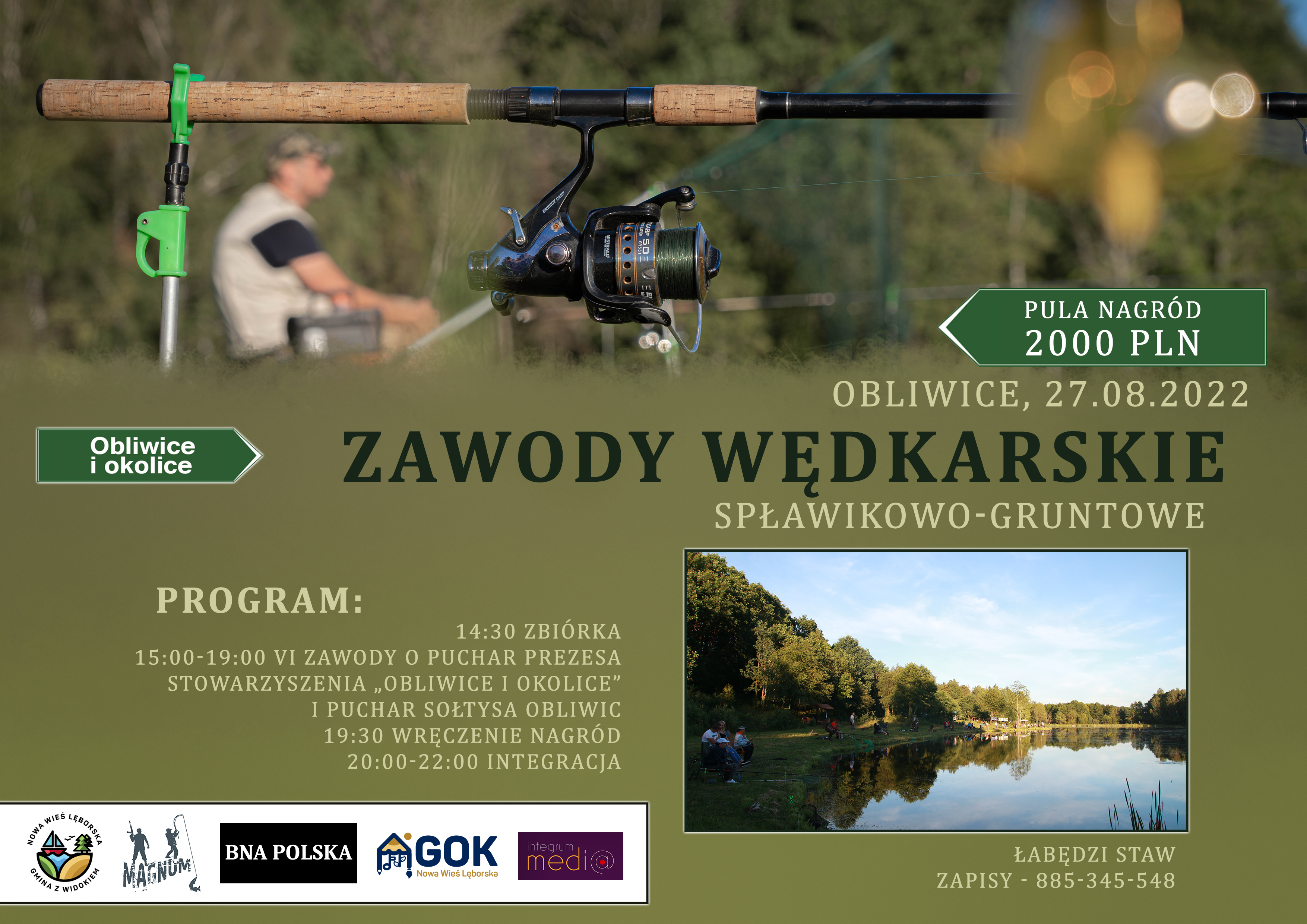 W ostatnią sobotę sierpnia (27.08.2022 r.) w Obliwicach nad 'Łabędzim Stawem odbędzie się kolejna edycja zawodów wędkarskich. W zmaganiach może wziąć udział 36 wędkarzy, którzy powalczą o Puchar Prezesa Stowarzyszenia "Obliwice i okolice" i Puchar Sołtysa Obliwic. Równolegle do wydarzenia trwać będzie pokaz malowania na drewnie, znanego lęborskiego artysty - Patryka Łukaszuka. Inicjatywa jest współfinansowana ze środków Gminy Nowa Wieś Lęborska.
