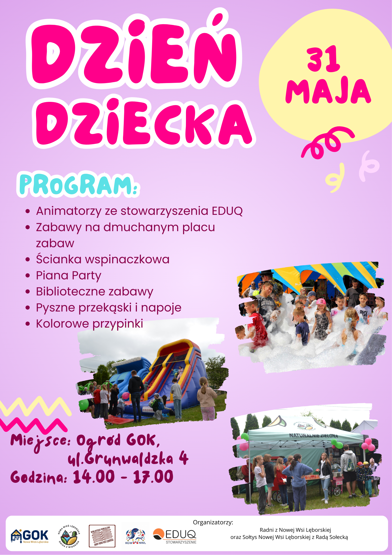 W związku ze zbliżającym się Dniem Dziecka na terenie naszej gminy zaplanowano szereg wydarzeń organizowanych m.in. przez sołectwa, Gminny Ośrodek Kultury oraz Przedszkole w Nowej Wsi Lęborskiej. Wszystkie inicjatywy mają na celu zapewnienie najmłodszym mieszkańcom gminy radosnych chwil, integracji oraz wspólnej zabawy w gronie rodziny i przyjaciół.
