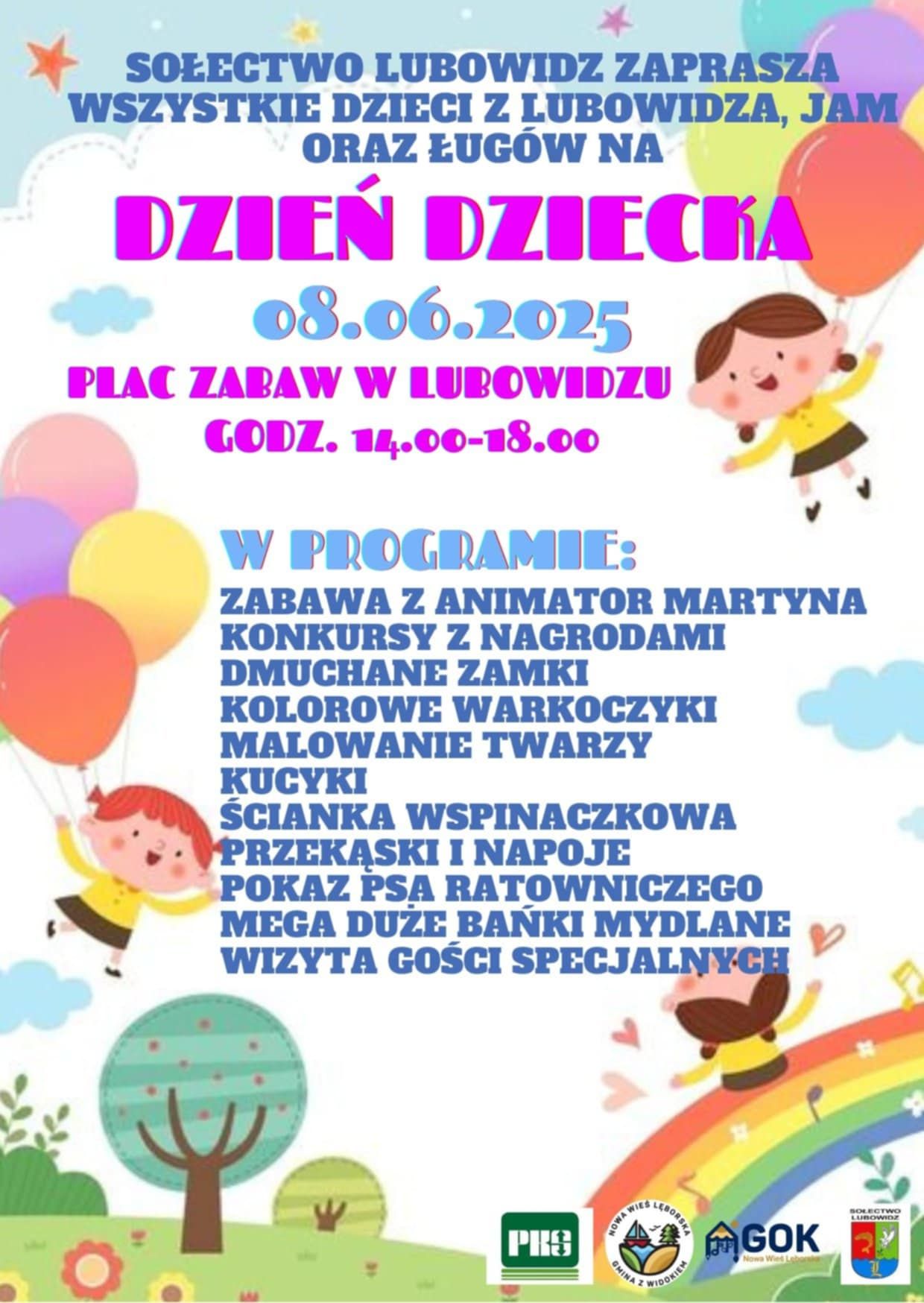 Sołectwo Lubowidz zaprasza wszystkie dzieci z Lubowidza, Jam oraz Ługów na wydarzenie pełne atrakcji. W programie: animacje, konkursy z nagrodami, dmuchane zamki, kolorowe warkoczyki, malowanie twarzy, przejażdżki na kucykach, ścianka wspinaczkowa, przekąski i napoje, pokaz psa ratowniczego, ogromne bańki mydlane oraz wizyta gości specjalnych.