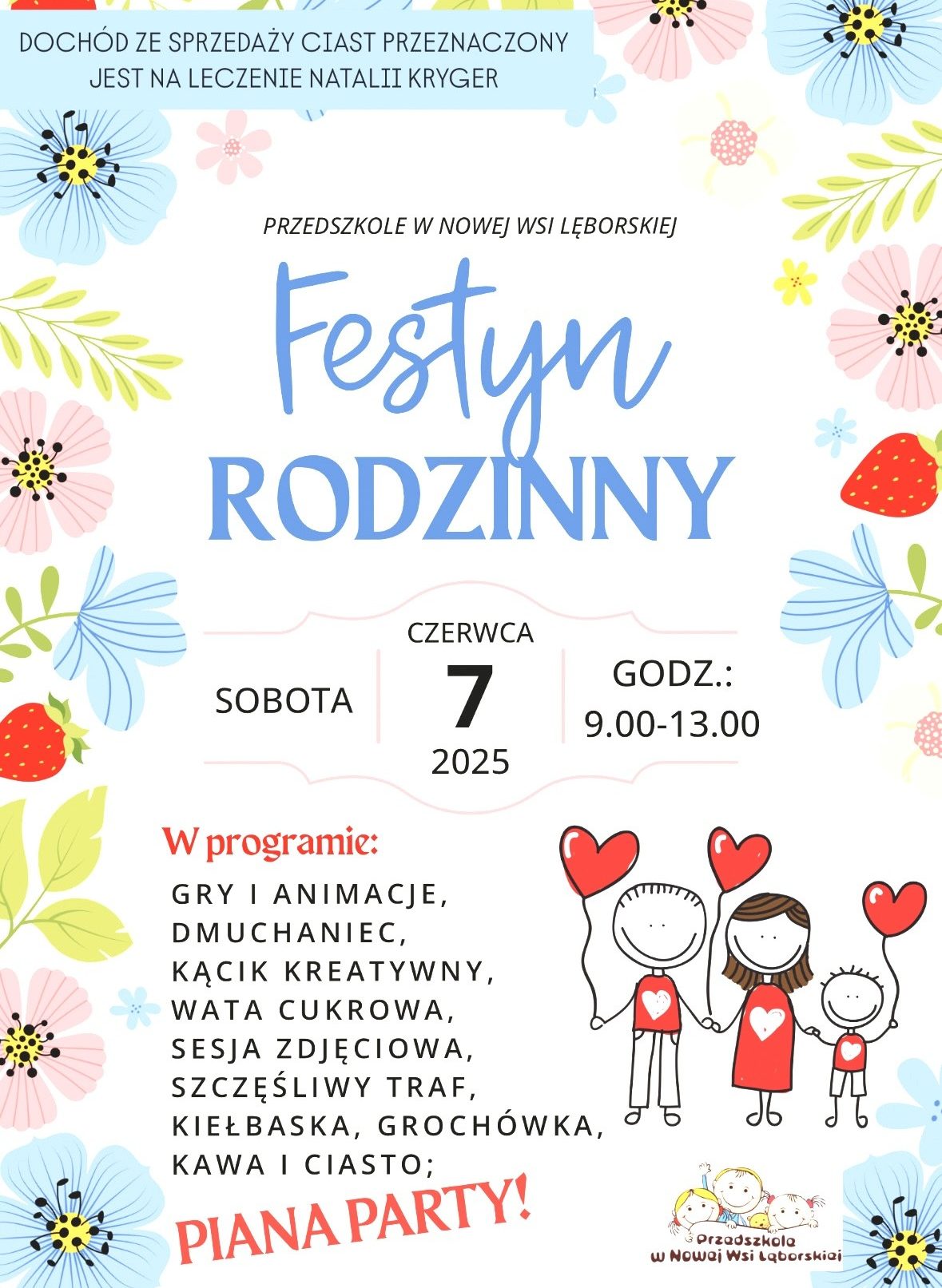 W programie: gry i animacje, dmuchaniec, kącik kreatywny, wata cukrowa, sesja zdjęciowa, konkursy, grochówka, kiełbaska, kawa i ciasto. Dochód ze sprzedaży ciast zostanie przeznaczony na leczenie Natalii Kryger.
