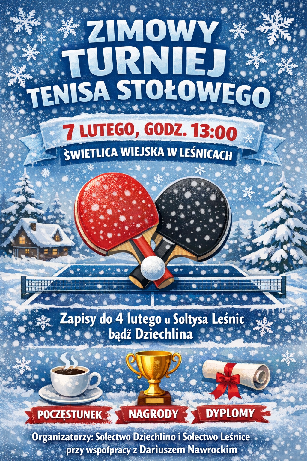 W najbliższą sobotę, 7 lutego o godzinie 13:00, w świetlicy wiejskiej w Leśnicach odbędzie się Zimowy Turniej Tenisa Stołowego. Na uczestników czekają poczęstunek, nagrody i dyplomy.