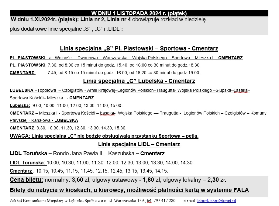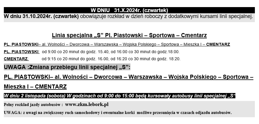 Zakład Komunikacji Miejskiej w Lęborku Sp. z o.o. informuje o zmianach w funkcjonowaniu komunikacji miejskiej oraz dodatkowych kursach w okresie Wszystkich Świętych: