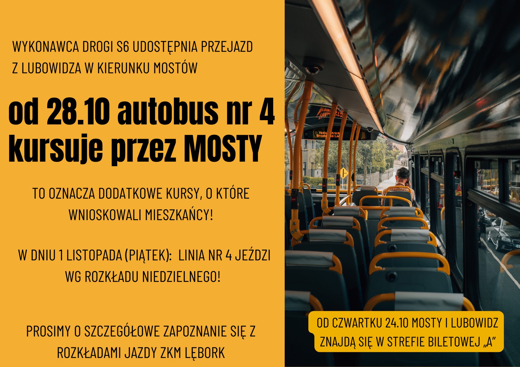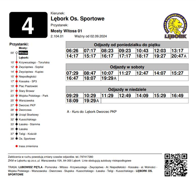 Linia nr 4 (trasa Lubowidz – Osiedle Sportowa) zmieni przebieg i będzie kursować przez Mosty (wjazd przez ul. Kwiatową dostępny tylko w kierunku do Lęborka.