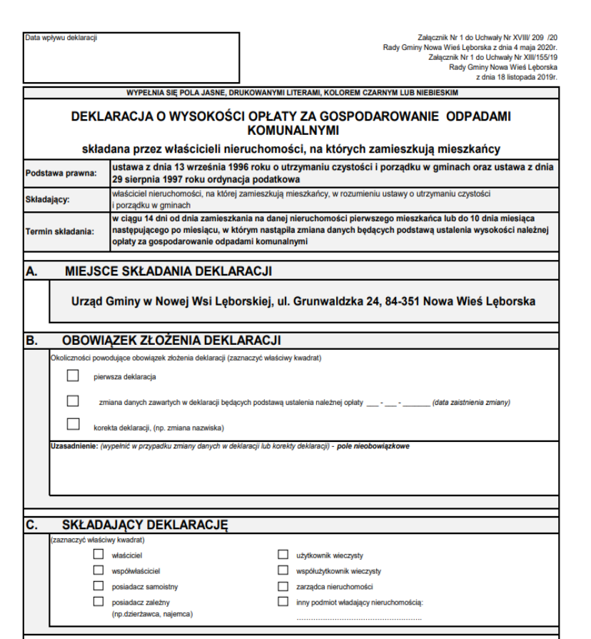 Urząd Gminy w Nowej Wsi Lęborskiej uprzejmie informuje, iż zgodnie z zapisami ustawy o utrzymaniu czystości i porządku w gminach właściciel nieruchomości jest obowiązany złożyć deklarację o wysokości opłaty za gospodarowanie odpadami komunalnymi w terminie 14 dni od dnia zamieszkania na danej nieruchomości pierwszego mieszkańca lub powstania na nieruchomości odpadów komunalnych.