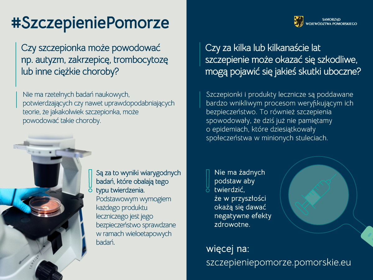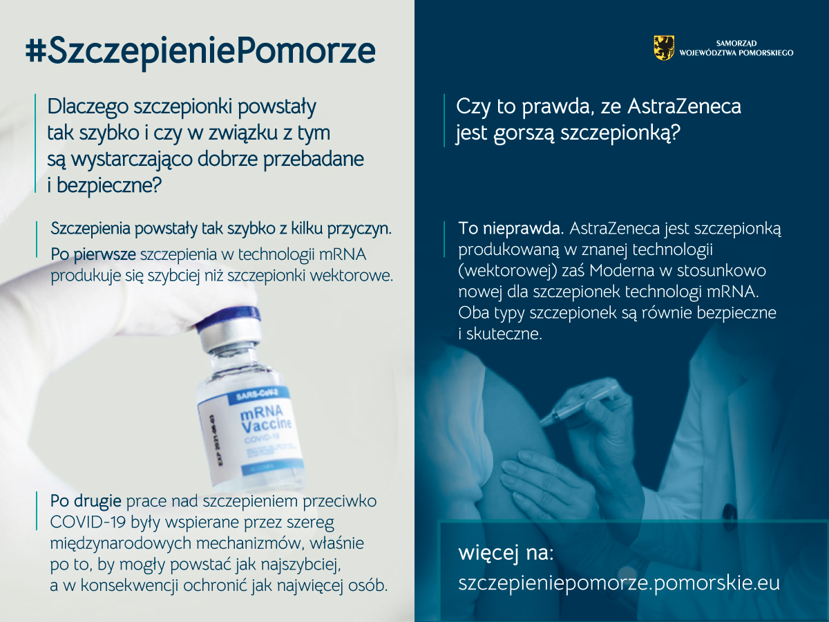 Samorząd Województwa Pomorskiego przygotował i prowadzi intensywną akcję promującą szczepienia ochronne. Przygotowane w oparciu o konsultacje ze specjalistami materiały zapewniają rzetelność i wiarygodność danych. Jednocześnie pomorskie szpitale i przychodnie zorganizowały blisko 400 punktów szczepień. Wspólnie zaprośmy do nich wciąż wahających się mieszkańców naszego regionu, wesprzyjmy tych, którzy mogą mieć problemy z rejestracją lub dotarciem.