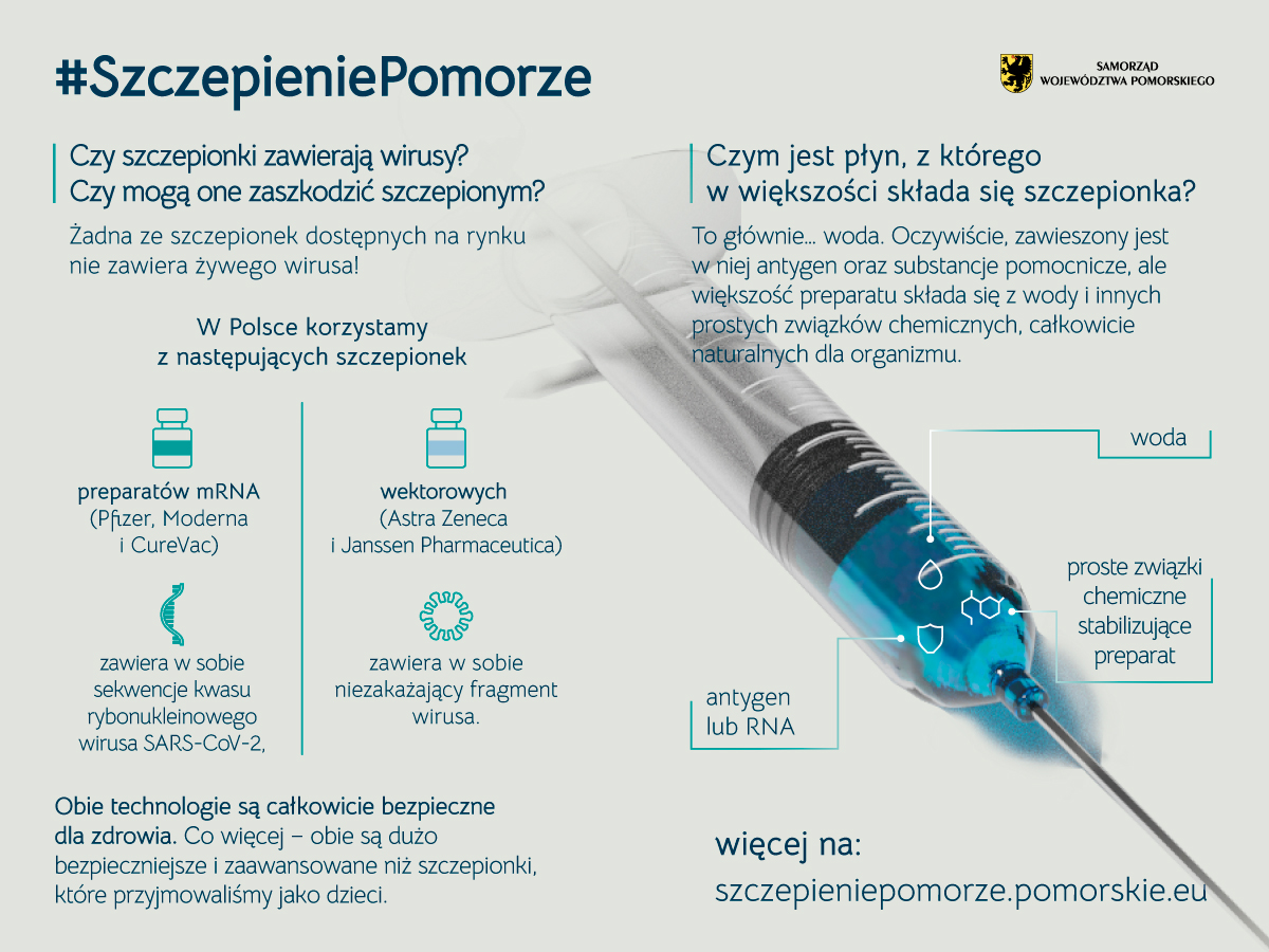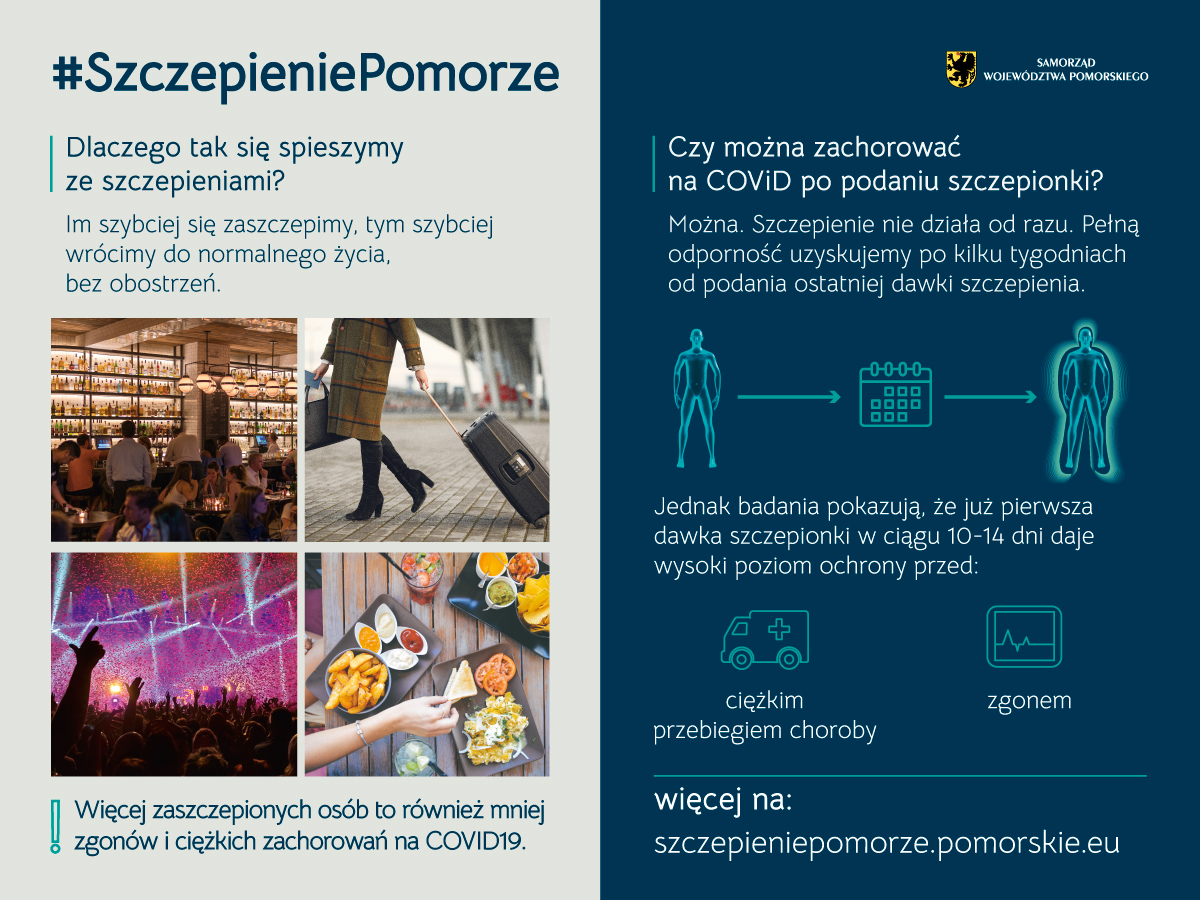 Samorząd Województwa Pomorskiego przygotował i prowadzi intensywną akcję promującą szczepienia ochronne. Przygotowane w oparciu o konsultacje ze specjalistami materiały zapewniają rzetelność i wiarygodność danych. Jednocześnie pomorskie szpitale i przychodnie zorganizowały blisko 400 punktów szczepień. Wspólnie zaprośmy do nich wciąż wahających się mieszkańców naszego regionu, wesprzyjmy tych, którzy mogą mieć problemy z rejestracją lub dotarciem.