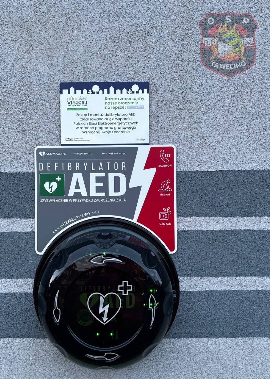 Nowy AED już służy mieszkańcom – urządzenie zostało zamontowane na budynku świetlicy w Rekowie Lęborskim. Sprzęt ten zwiększy skuteczność działań strażaków oraz bezpieczeństwo w lokalnej społeczności. Serdecznie gratulujemy druhom z OSP Tawęcino i dziękujemy Polskim Sieciom Elektroenergetycznym za wsparcie lokalnych inicjatyw. Program „Wzmocnij Swoje Otoczenie” to ogólnopolska inicjatywa grantowa wspierająca lokalne społeczności w działaniach na rzecz ochrony środowiska, edukacji i rozwoju infrastruktury.
