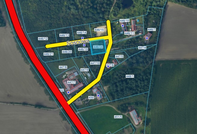 Nieruchomość gruntowa niezabudowana, z możliwością uzbrojenia (woda, energia w sąsiedniej działce 446/17- ul. Sosnowa). Działka o regularnym kształcie, nieogrodzona, teren wymaga wyrównania. W południowo-wschodniej części działki znajduje się słup energetyczny niskiego napięcia oraz przebiega napowietrzna linia energetyczna niskiego napięcia. W południowo-wschodniej części działka zakrzaczona.